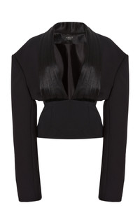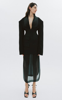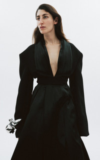 PRODUCT DETAILS - Oversized fit, padded shoulder, cinched waist silhouette - Front Button Closure - Lined - Composition: 100% Polyester; 100% Acetate - Color: black - Dry Clean Only - Spring '25