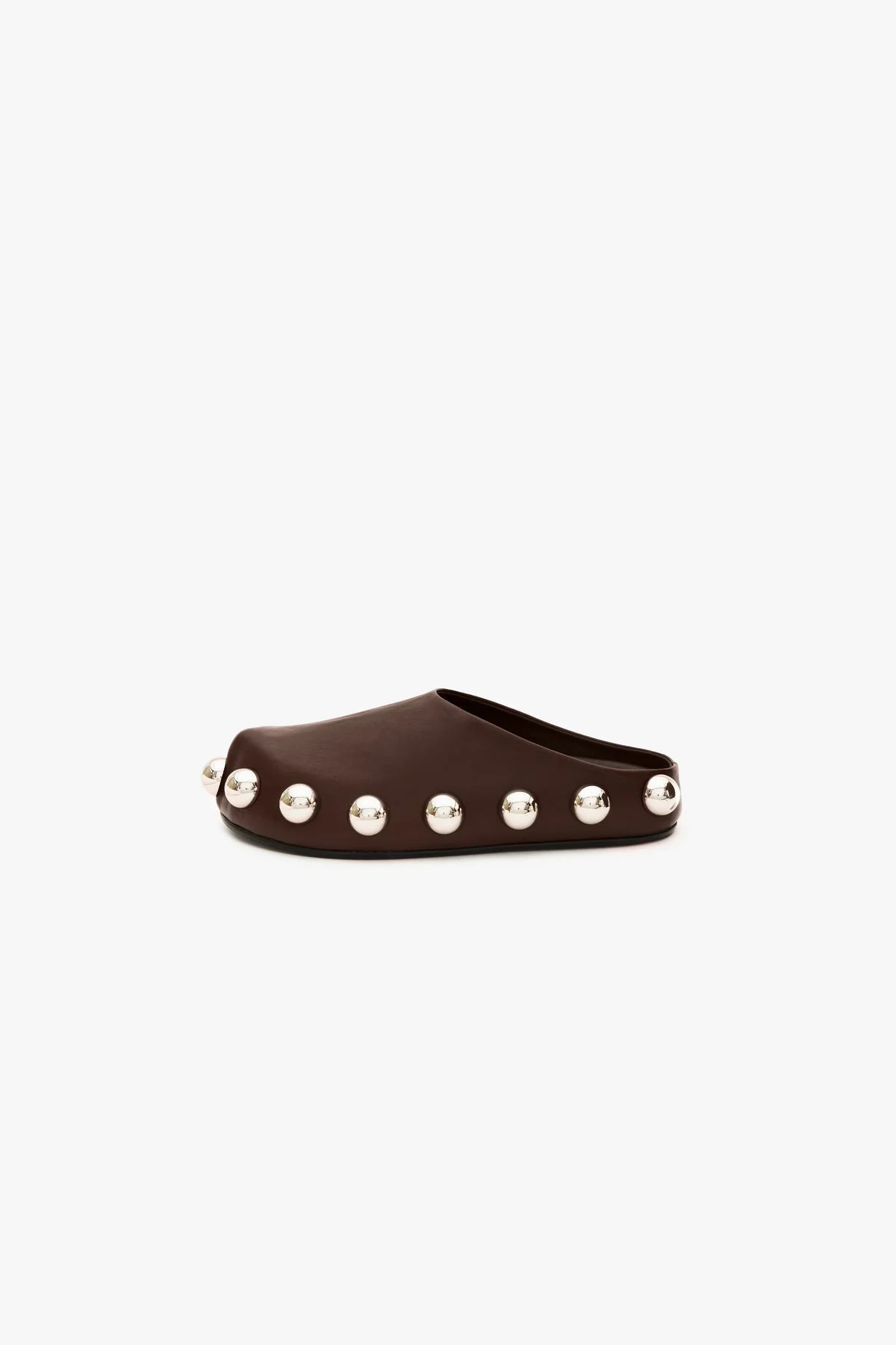 Handcrafted in Italy, these clogs reimagine the traditional style with bold, modern flair. Embellished with large exaggerated silver studs along the edges, they feature a flat silhouette, round toe and easy slip-on design. FIT & SIZE - Designed with comfortable padded soles that provide a generous fit. - We recommend opting for a size smaller, especially if you are between sizes. PRODUCT DETAILS - Upper: 100% Nappa Leather; Lining: 100% Leather - Comes with a dust bag. - Made in Italy.