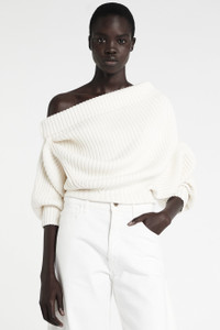 Knitted from a cotton-wool blend, this off-shoulder sweater features a finely ribbed construction. The bodice is designed with an inverted, upside-down effect, offering a relaxed fit at the top and a more fitted shape at the waist. Draped quarter-length sleeves and shoulder details enhance the sculptural silhouette, while a button closure at the back completes the piece with precision. Shown here with Denim Jeans With Inserts White Denim and Dana Sister Ankle Boot Brown. FIT & SIZE - Designed with a relaxed fit at the bust and slim fit around the waist. - True to size, we recommend choosing your regular size. - Model is 181 cm / 5'11" (bust: 74 cm / 29”, waist: 61 cm / 24”, hips: 87 cm / 34½”) and is wearing size XS. PRODUCT DETAILS - 83% Cotton 17% Wool - Heavyweight material. - Button closure. - Unlined. - Dry clean. - Made in Lithuania.