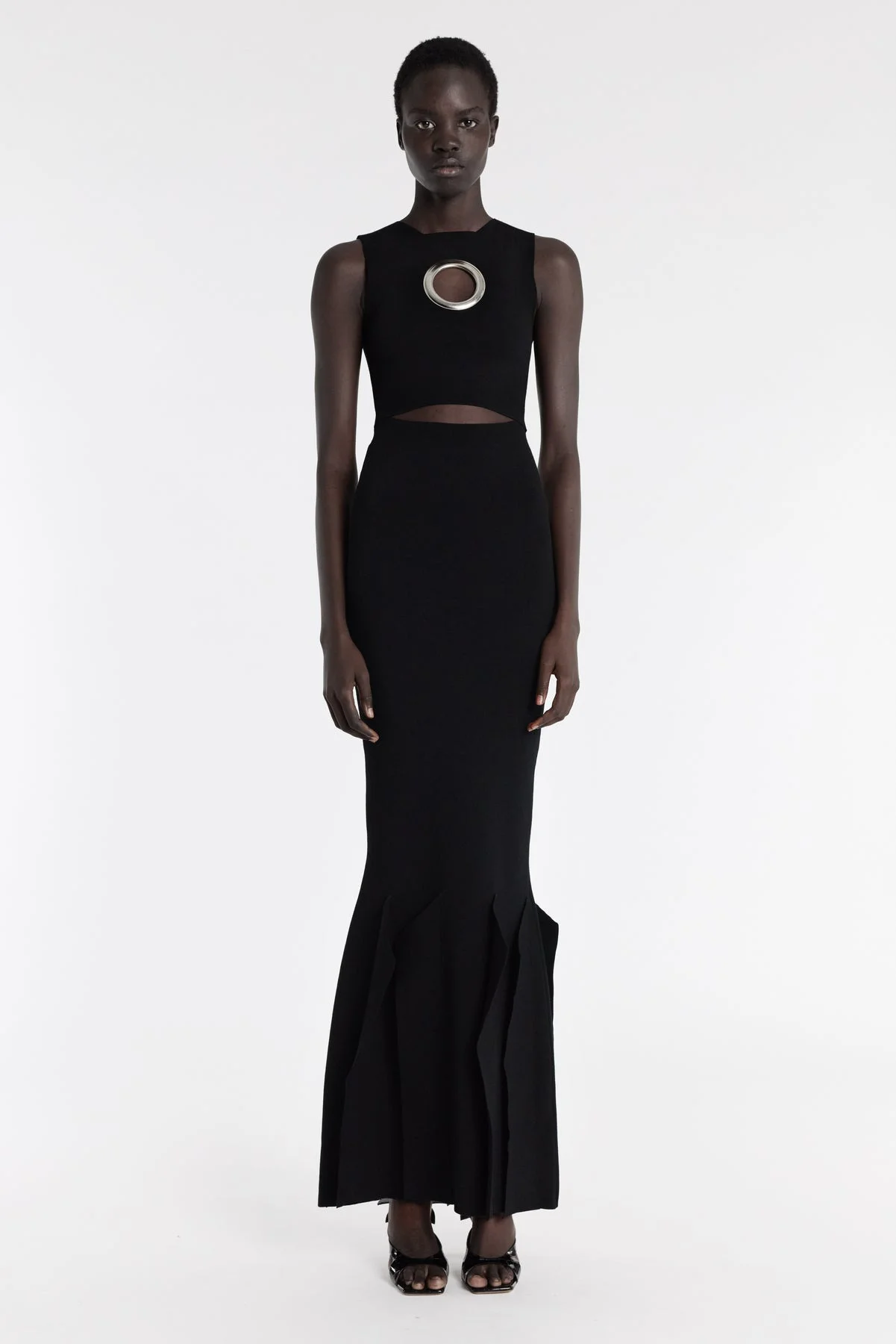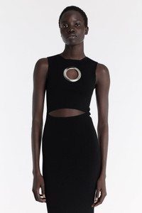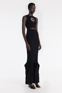 Fitted through the waist and thigh, this dress features keyhole cut-outs at the chest and waist, flaring into sculpted volume with 3D hem panels. FIT & SIZE - Designed with a slim fit. - True to size we recommend choosing your regular size. - Model is 181 cm / 5'11" and is wearing a size XS PRODUCT DETAILS - 70% Viscose 30% Polyester - Dry clean. - Made in Lithuania.