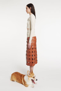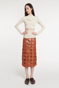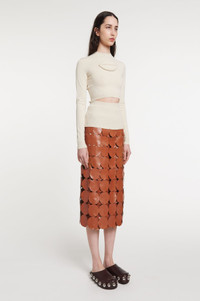 Knit top with 3D Lips decoration and waist cut out at the front. It has a crew neckline, long elongated sleeves and a slim waistline. Shown here with Multi Circle Double Layered Skirt Brick and Gabi Clog With Exaggerated Studs Brown Silver. FIT & SIZE - Designed with a slim fit around the chest and at the waist. - True to size, we recommend choosing your regular size. - Model is 177 cm / 5'9.7" and is wearing a size XS. PRODUCT DETAILS - 70% Viscose 30% Polyester - Hand wash or dry clean. - Made in Ukraine.