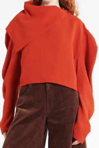Cut from lightweight poly crepe, this long-sleeve draped collar top reinterprets classic shirting with an airy, architectural silhouette. Oversized rounded sleeves and a loose fit create relaxed volume, while the draped collar cascades asymmetrically for sculptural movement. A button closure at the neckline offers a refined finish, balancing fluidity with directional structure. Shown here with Lea Burgundy. Available in khaki. FIT & SIZE - Designed with a regular fit. - True to size, we recommend choosing your regular size. - Model is 181 cm / 5'9" (bust: 81 cm / 31”, waist: 61 cm / 24”, hips: 89 cm / 35”) and is wearing a size FR 34. PRODUCT DETAILS - 100% Polyester - Midweight material. - Non-detachable collar. - Button closure. - Unlined. - Dry clean. - Made in Poland.