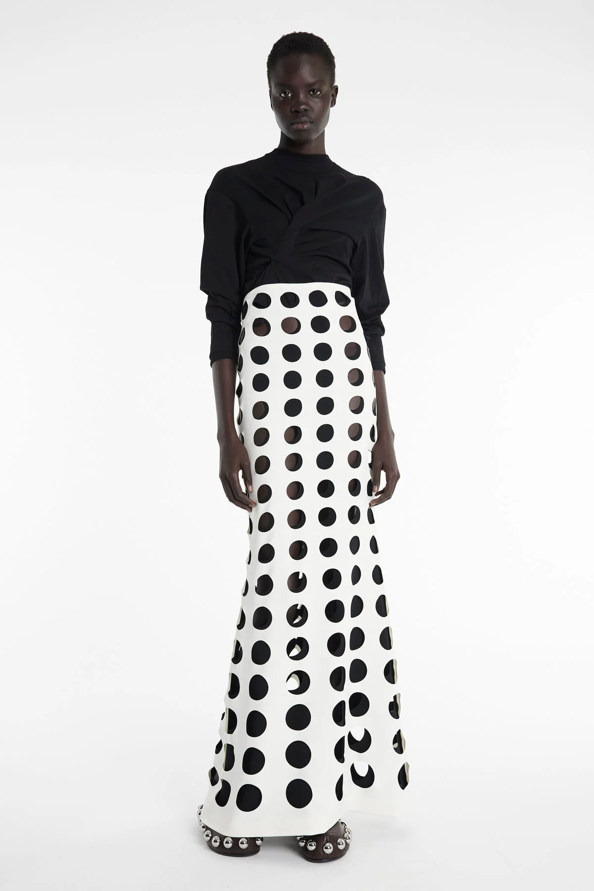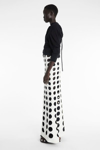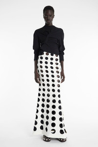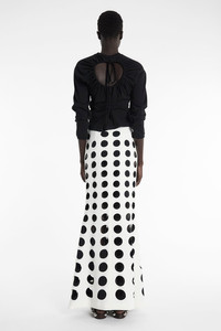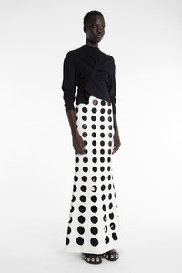This high-rise maxi skirt is defined by layered cut-outs that create a graphic contrast in black and white. Designed for ease, it pulls on effortlessly and drapes with an A-line silhouette. Shown here with Longsleeve Knotted Jersey Top Black and Gabi Clog With Exaggerated Studs Brown Silver.Available in black nude. FIT & SIZE - Designed with a high-rise and a maxi hem. - True to size we recommend choosing your regular size. - Model is 181 cm / 5'11" and is wearing a size FR 34. PRODUCT DETAILS - Fabric1: 85% Polyester 15% Polyurethane; Fabric2: 92% Polyester 8% Polyamide - Pull-on style. - Dry clean. - Made in Lithuania.