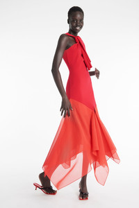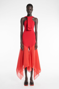 This statement red gown pairs a knit bodice with an open back and sculpted neckline, contrasted by a voluminous skirt in sheer organza. The interplay of textures and transparency adds dimension, while the midi-length silhouette makes for a bold, refined impression. Shown here with Delta Flip Flop Red. FIT & SIZE - Designed with a slim fit. - True to size, we recommend choosing your regular size. - Model is 180 cm / 5’11’’. PRODUCT DETAILS - Fabric1: 70% Viscose 30% Polyester; Fabric2: 100% Cotton - Slip on silhouette. - Dry clean. - Made in Lithuania. Please note that the red colour of the knit part of the dress is slightly different in shade from the organza hem - as per the imagery.