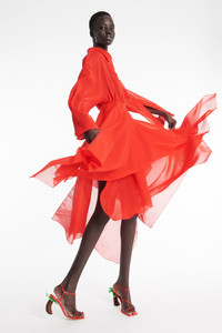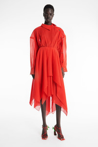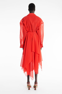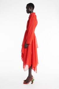 Crafted from semi-sheer silk chiffon, this dress features structured boning at the shoulders and pleated cuffs for subtle architectural framing. Gathered at the waist, the silhouette falls into an asymmetric hem, while the layered cut-out back adds depth and dimension. Partially lined to maintain its lightness. Shown here with Bianca Red. FIT & SIZE - Designed with a regular fit. - True to size, we recommend choosing your regular size. - Model is 180 cm / 5’11’’. PRODUCT DETAILS - 100% Cotton - Button fastenings through front and sleeve. - Zip fastening. - Unlined. - Dry clean. - Made in Poland.