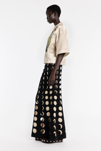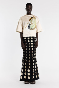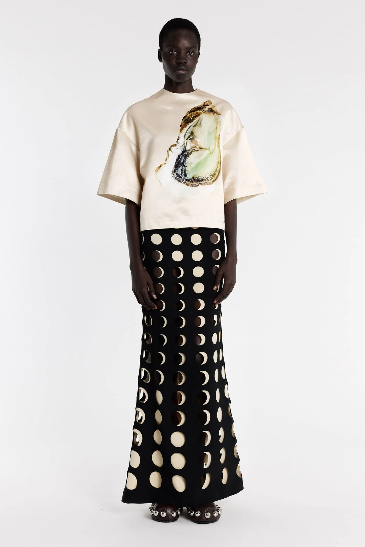 Cut from glossy satin, this oversized tee is designed with dropped shoulders, short sleeves and a classic round neckline. The relaxed silhouette gives sculptural ease, while the oyster graphic print adds a surreal edge to this everyday staple. Shown here with Layered Circular Cutouts Skirt Black Nude and Gabi Clog With Exaggerated Studs Brown Silver. FIT & SIZE - Designed with an oversized fit. - True to size, we recommend choosing your regular size. - Model is 181 cm / 5'11" (bust: 74 cm / 29”, waist: 61 cm / 24”, hips: 87 cm / 34½”) and is wearing a size S. PRODUCT DETAILS - 100% Acetate - Zip fastening. - Dry clean. - Made in Lithuania.