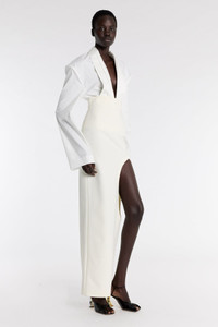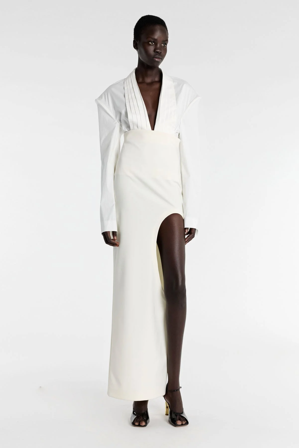 Cut to a slim silhouette, this high-rise maxi skirt features a sharp cut-out detail on the side and a high back split. Made to slip on with ease, it brings a subtle edge to streamlined dressing. Shown here with Cummerbund Collar Tuxedo Top White and Giustine Black Patent Leather. Also available in black, emerald green navy and burgundy navy. FIT & SIZE - Designed with a slim fit and maxi hem. - True to size we recommend choosing your regular size. - Model is 181 cm / 5'11" and is wearing a size FR 34. PRODUCT DETAILS - 86% Polyester 10% Elastane 4% Polyamide - Pull-on style. - Unlined. - Dry clean. - Made in Poland.