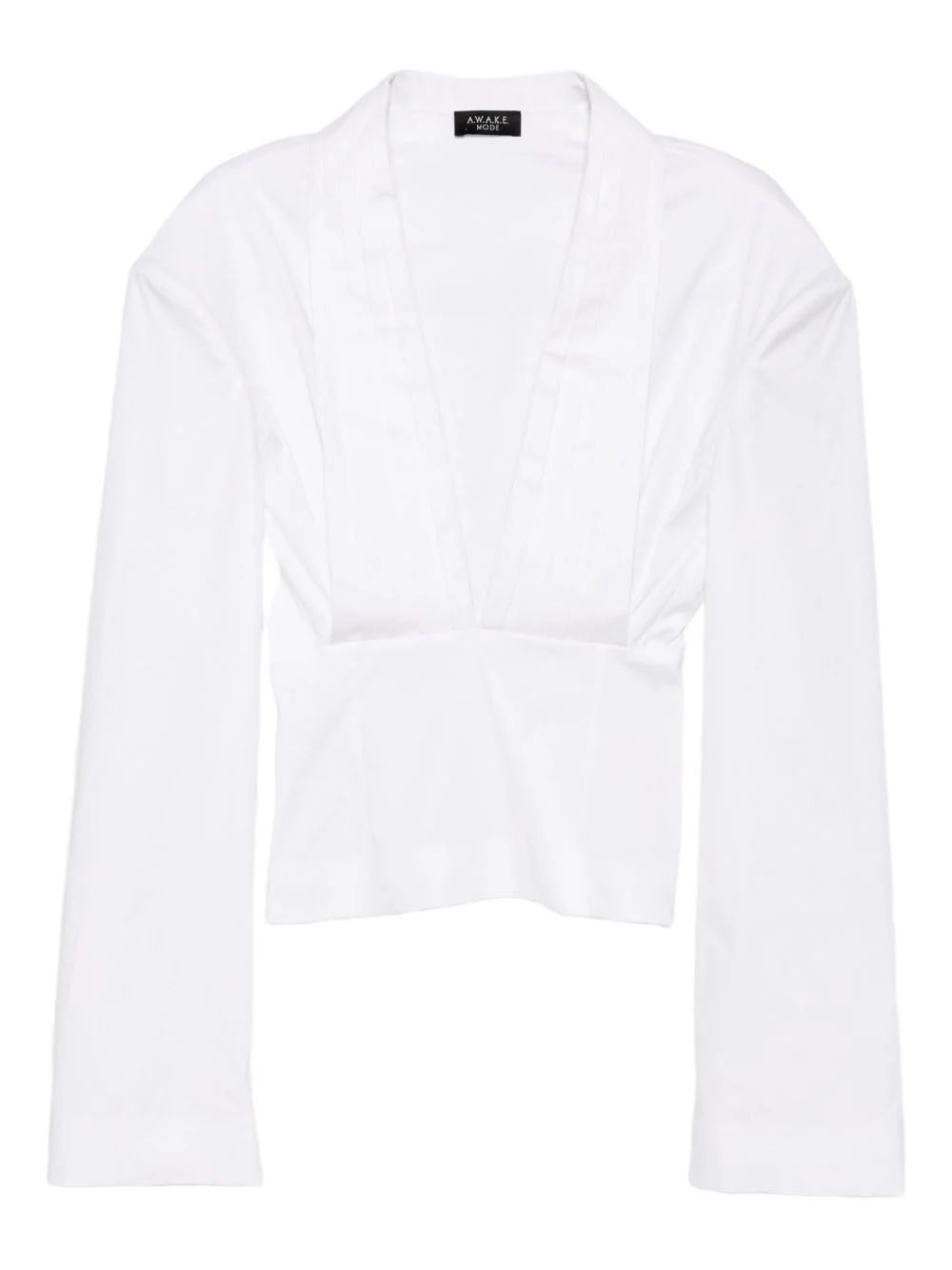 pleated top Highlights - White - Concealed side zip fastening - Plunging v-neck - Long sleeves - Short slit sleeves Imported Composition Cotton 96%, Elastane 4% Washing instructions Dry Clean Only