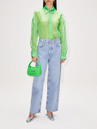 Lightweight and airy, this sheer green top is a sight to behold. The vivid hue brings a summery feel to the relaxed silhouette, defined by easy dropped shoulder seams, a point collar, button cuffs and clean straight hem. Style with a midi skirt, or over a multicolored dress! Details 100% silk Shirt collar Dropped shoulders Long sleeves with button cuffs Front button closures Sheer fabric Relaxed fit Made in Poland Dry clean only Item # 1-157679 Designer