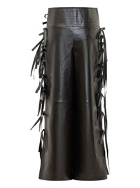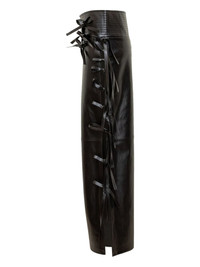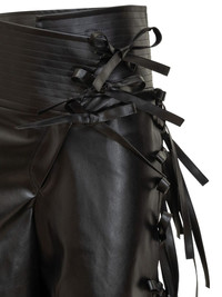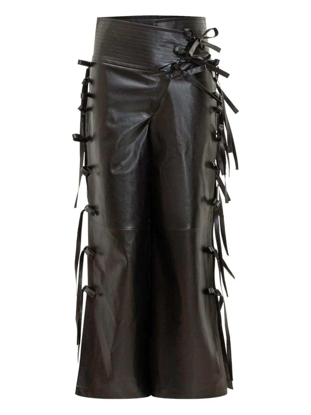 bow-detail trousers Highlights - Black - Side tie fastening - Asymmetric edge - Wide leg - Glossy finish Imported Composition Polyester 51%, Resin 49%
