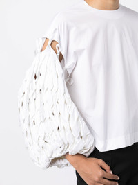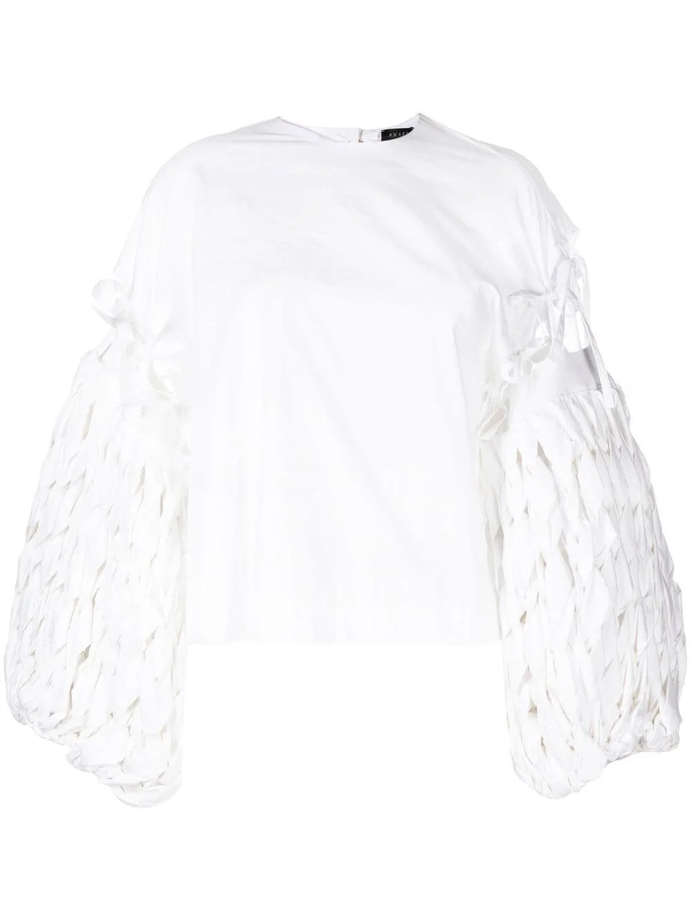 woven puff-sleeve blouse white cotton blend cut-out detailing interwoven design long puff sleeves straight hem Imported Composition Cotton 96%, Elastane 4% SIZE & FIT Model measurements Height 5 ft 10 in(1.77 m) Bust/Chest 31.49 in(80 cm) Hips 35.43 in(90 cm) Waist 25.19 in(64 cm) FittingInformation This piece fits true to size. We recommend you get your regular size Cut for a loose fit Made with a heavyweight stretch fabric Washing instructions Dry Clean Only