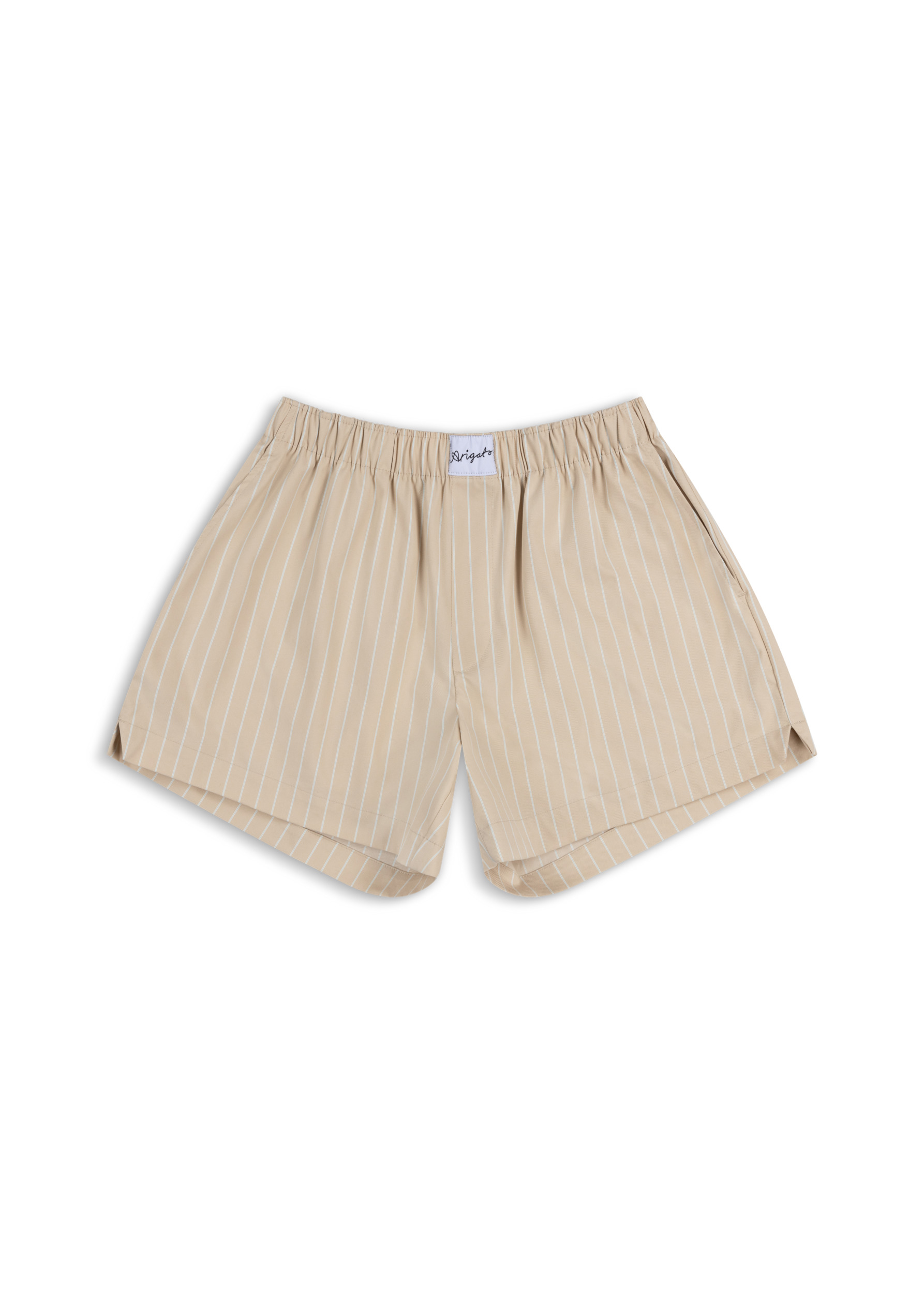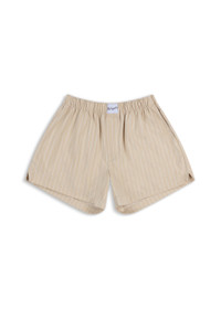 Introduced in the FW24 campaign, the unisex cotton shorts have a classic, boxer-inspired silhouette that's finished with pockets and notched hems. Our signature handwritten logo customizes this striped pair. These shorts are unisex. For more information on sizing, please refer to the Size & Fit chart below. Style Details - 67% Cotton +29% Polyester +4% Elastane - Elasticated waistband - Custom stripe - Arigato seasonal woven label - Relaxed Unisex fit - Side pockets - Side slit - 30 degrees gentle cycle - Crafted in Portugal