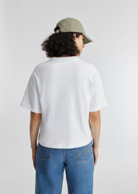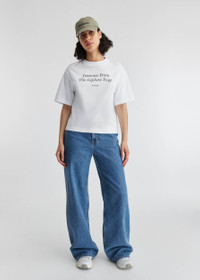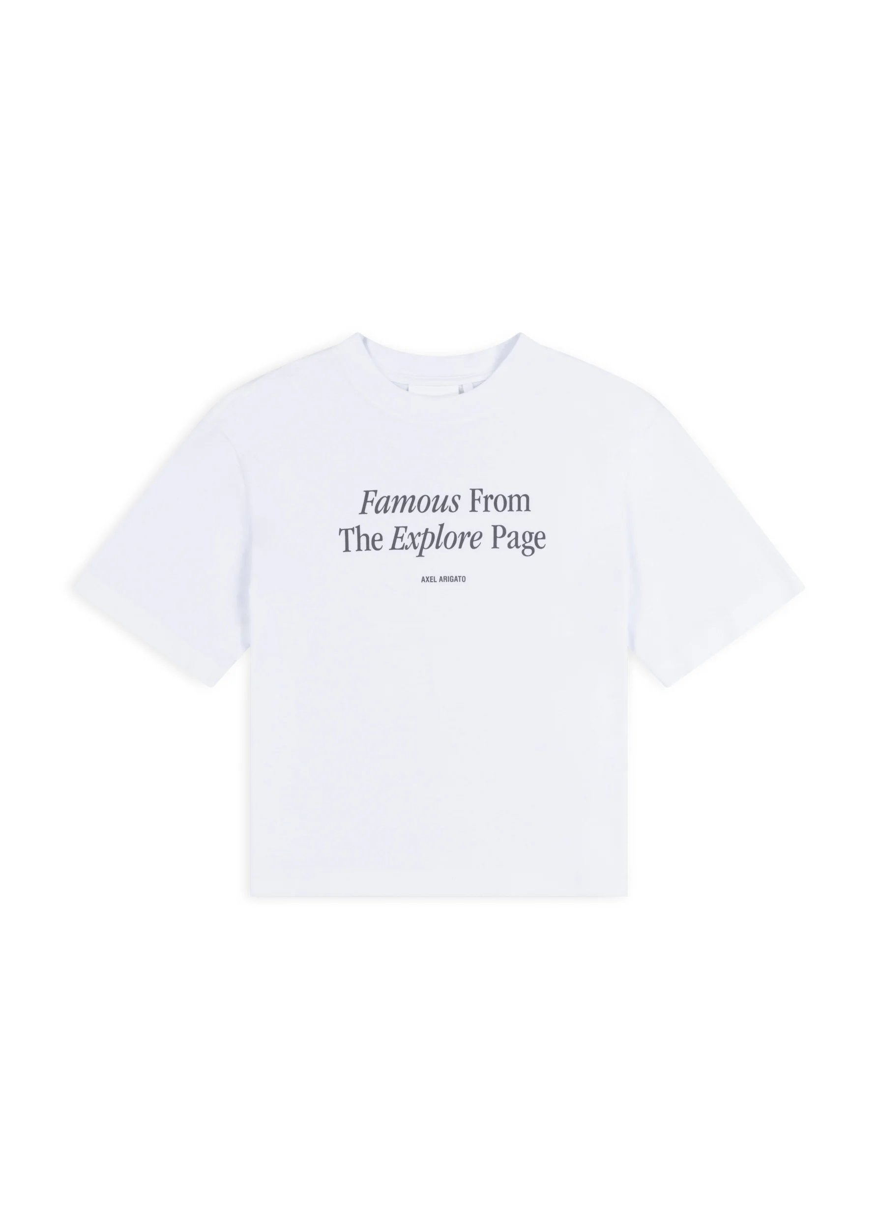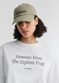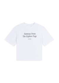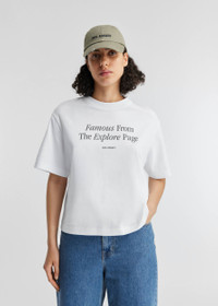 The Famous T-shirt is cut from organic cotton in a crew-neck silhouette. It’s screen-printed with our seasonal slogan, ‘Famous from the explore page’. The model is 178 cm / 5”10 ft and wears a size S.