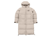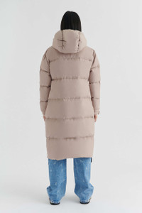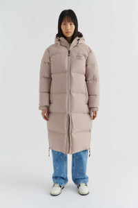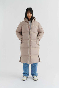 The Lumia Down Puffer Coat is a redesign of the classic puffer, now portrayed in a lightweight long silhouette with zipped up side sections. The shell is made of recycled polyester combined with reprocessed down content, detailed with a Arigato 2014 chest print, a detachable hood and front two-way-zip. Scan the QR code on the label of this puffer jacket to trace its journey. This jacket is designed to be worn in the city, so it isn’t waterproof but only slightly water repellent. If you find yourself in a downpour, make sure to dry your jacket properly to avoid mold or stains. The model is 176 cm / 5'8 ft and wears a size S. Style Details - Main fabric: 100% Recycled Polyester - Filling material: 85% Re-Used Duck Down 15% Feather - Fill Power: 750 - Made in China - Zip closure at front - Elastic drawstring hem - Detachable hood - 2 front welt pockets with zip closure - High collar - Branded zip pullers - Printed graphics on chest
