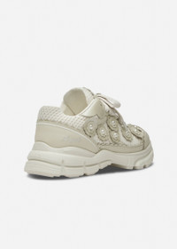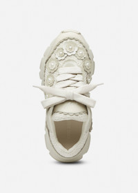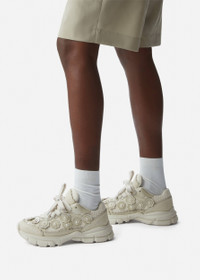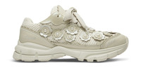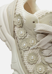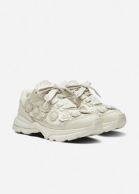The Marathon FLWR Runner is adorned with patent-leather flowers centered by lustrous pearls – the monochrome appliques are a nod to Y2K design. Handcrafted in Portugal, this playful pair features scalloped edges and branded embroidery. Style Details - Upper: 44% Leather + 26% Patent Leather + 10% Recycled Cotton + 20% Recycled Polyester - Lining: 76% Polyester + 14% Elastane + 10% Microfiber - Sole: 100% TR; heel height measuring 35mm - European Sizing - Reflective webbing and transfer detail - Branded TPU tongue branding - Side quarter bubble branding - Decorative leather and pearl flowers on the upper - Handmade in Portugal