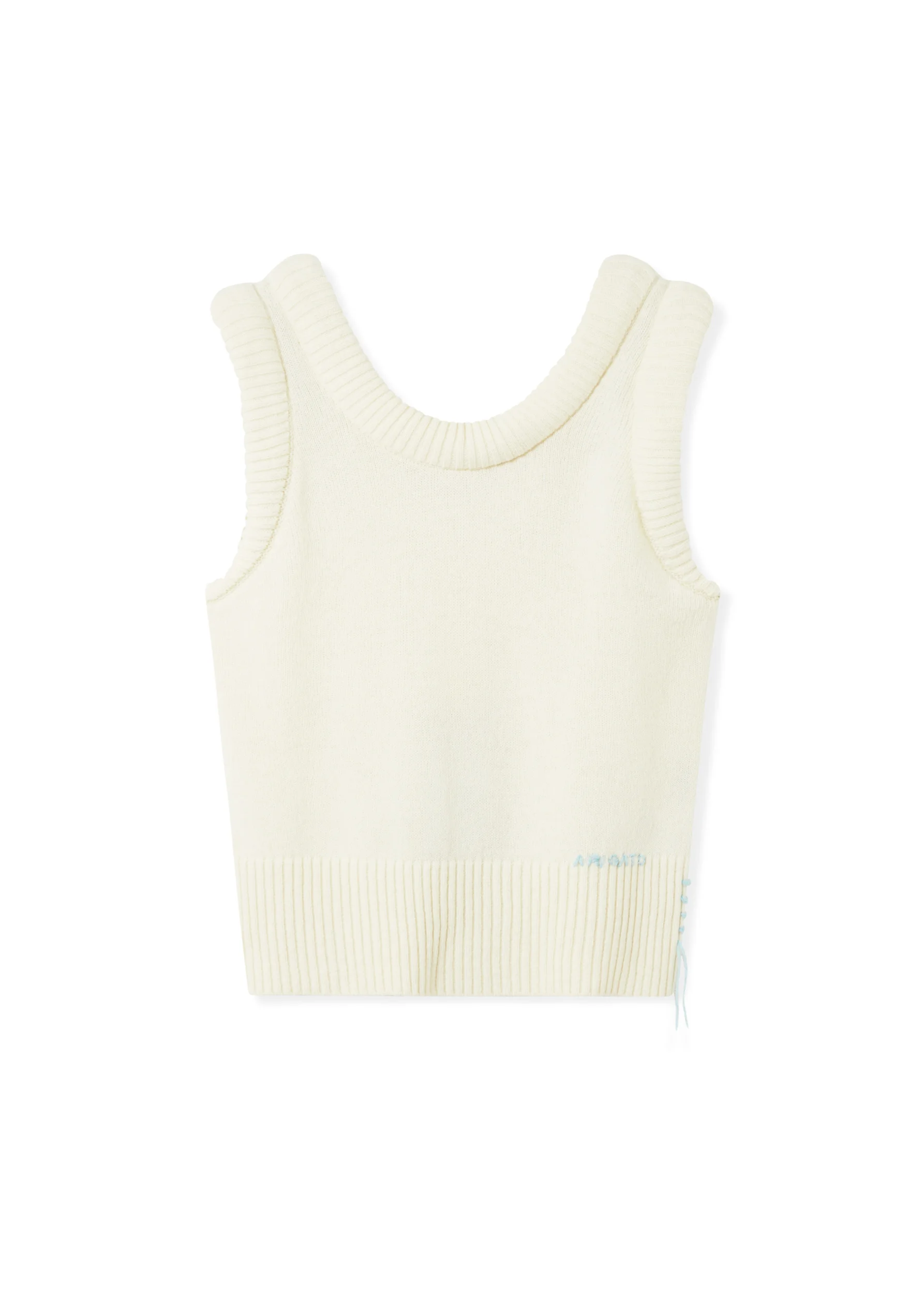 Knitted from a soft wool-blend, the Marla vest is padded around the neckline and armholes to create subtle volume in the slim silhouette. Looped hand-stitching and embroidery finish this piece. This item is made from carefully selected, high-quality yarns. Due to the fabric’s nature, pilling may occur and will gradually lessen over time. It can be removed with a pilling comb. Handle with care to preserve the original appearance of this piece for as long as possible. The model is 172 cm / 5’8” ft and wears a size S. Style Details - 50% Wool 50% Polyamide - Slim fit - Padded ribbed neckline and armhole - Hand embroidered loop stitching detail - Hand embroidered 'Arigato' logo at bottom hem - Can be worn back to front - Crafted in China - Care instructions: Hand wash cold