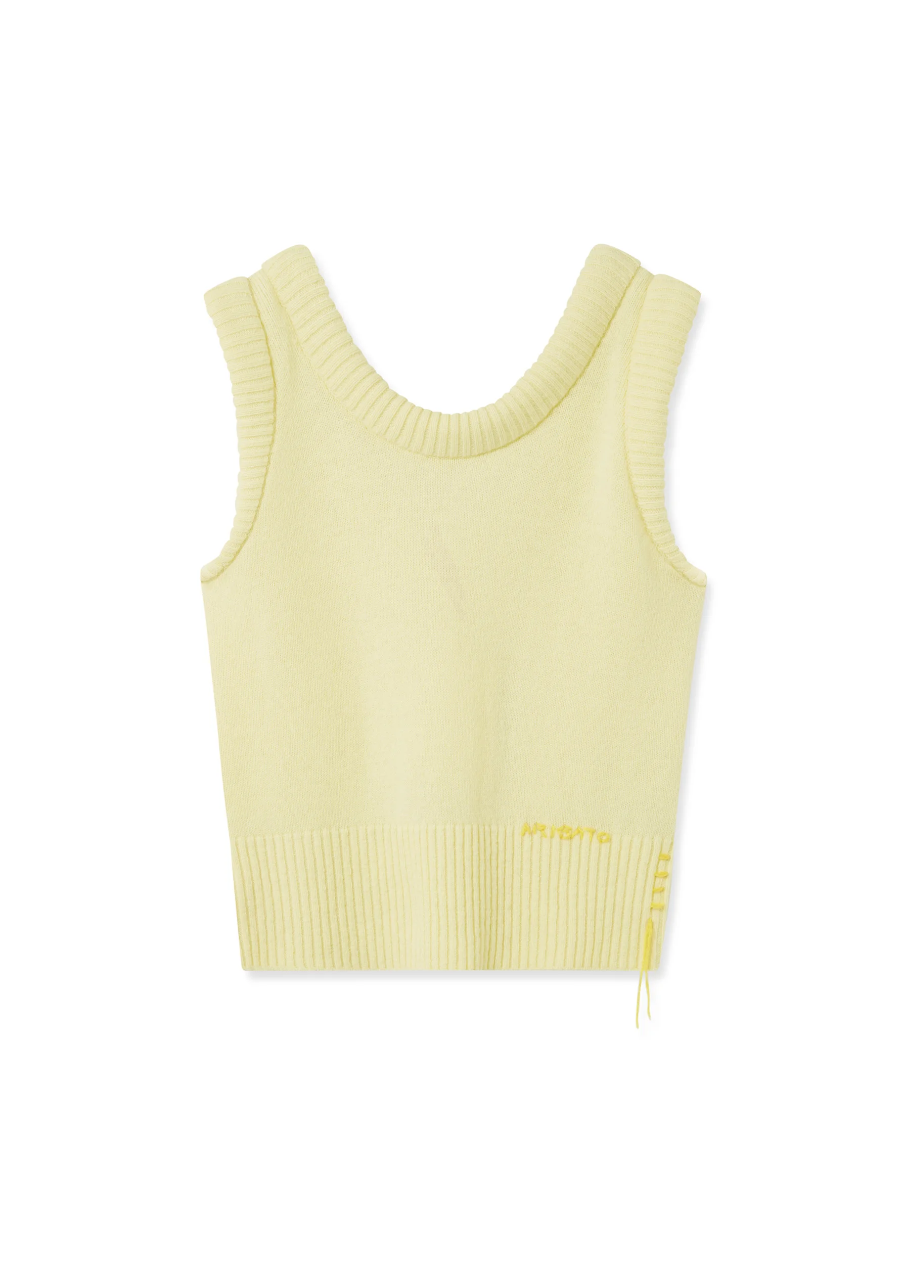 Knitted from a soft wool-blend, the Marla vest is padded around the neckline and armholes to create subtle volume in the slim silhouette. Looped hand-stitching and embroidery finish this piece. This item is made from carefully selected, high-quality yarns. Due to the fabric’s nature, pilling may occur and will gradually lessen over time. It can be removed with a pilling comb. Handle with care to preserve the original appearance of this piece for as long as possible. The model is 172 cm / 5’8” ft and wears a size S. Style Details - 50% Wool 50% Polyamide - Slim fit - Padded ribbed neckline and armhole - Hand embroidered loop stitching detail - Hand embroidered 'Arigato' logo at bottom hem - Can be worn back to front - Crafted in China - Care instructions: Hand wash cold