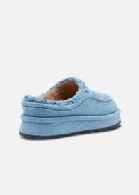 The Pillow mule has a bold, contemporary silhouette that draws from different elements of classic footwear styles. Designed with amplified proportions, it’s crafted in Portugal from Italian denim and features a distressed panel for textural contrast. Fluid piping and a supportive branded sole finish this pair. Style Details - Upper: 100% Cotton - Lining: 70% Microfibre, 30% Polyester - Sole: 80% EVA, 20% TPU - Height Measures 40mm - European Sizing - Italian Denim - Slip on - Wrapped midsole - Handcrafted in Portugal
