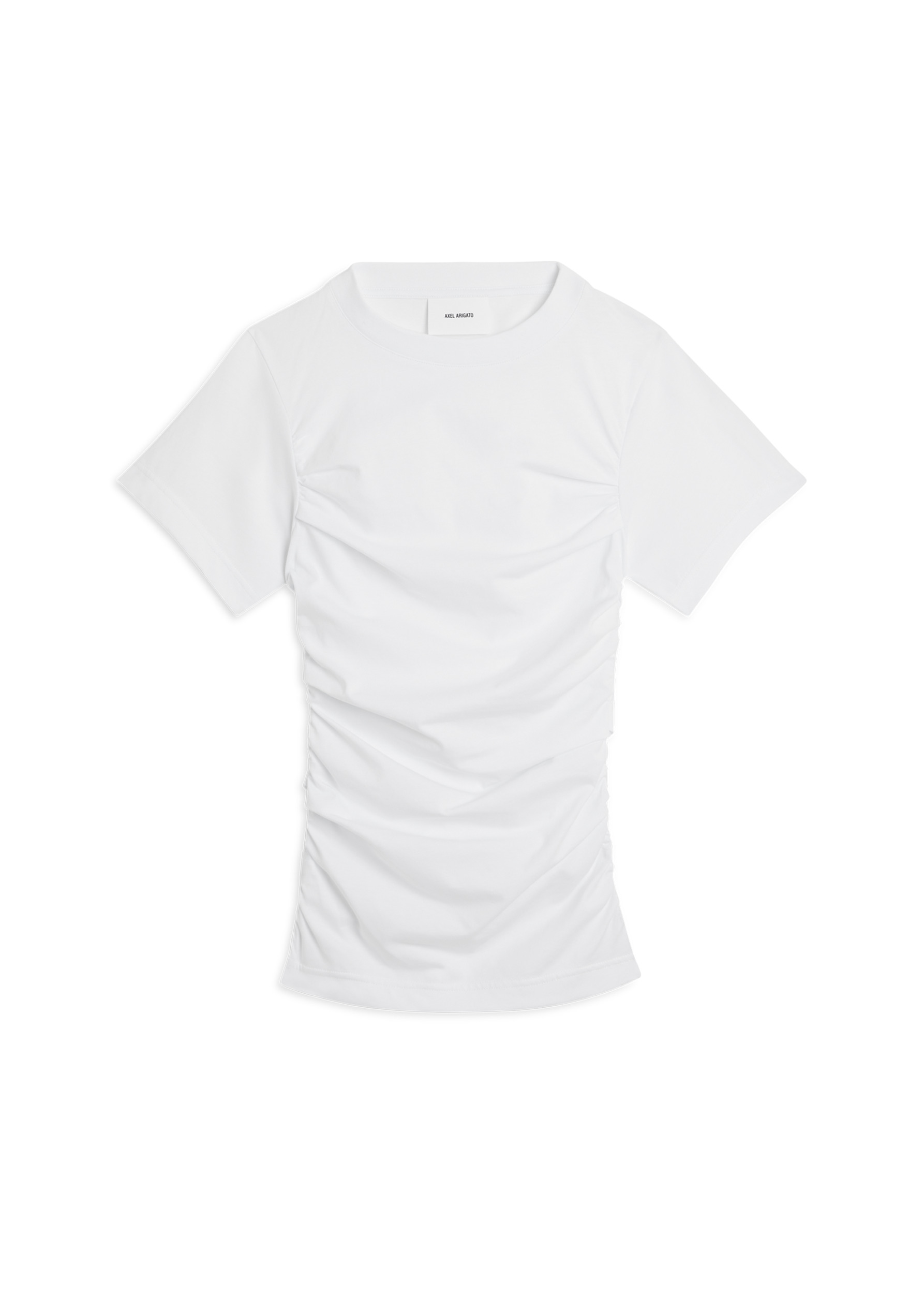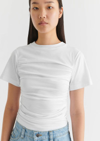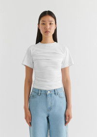 The Ria T-shirt is gathered along the side seams to create ripples through the soft organic cotton. The model is 178cm / 5'10.5 ft and wears a size S.