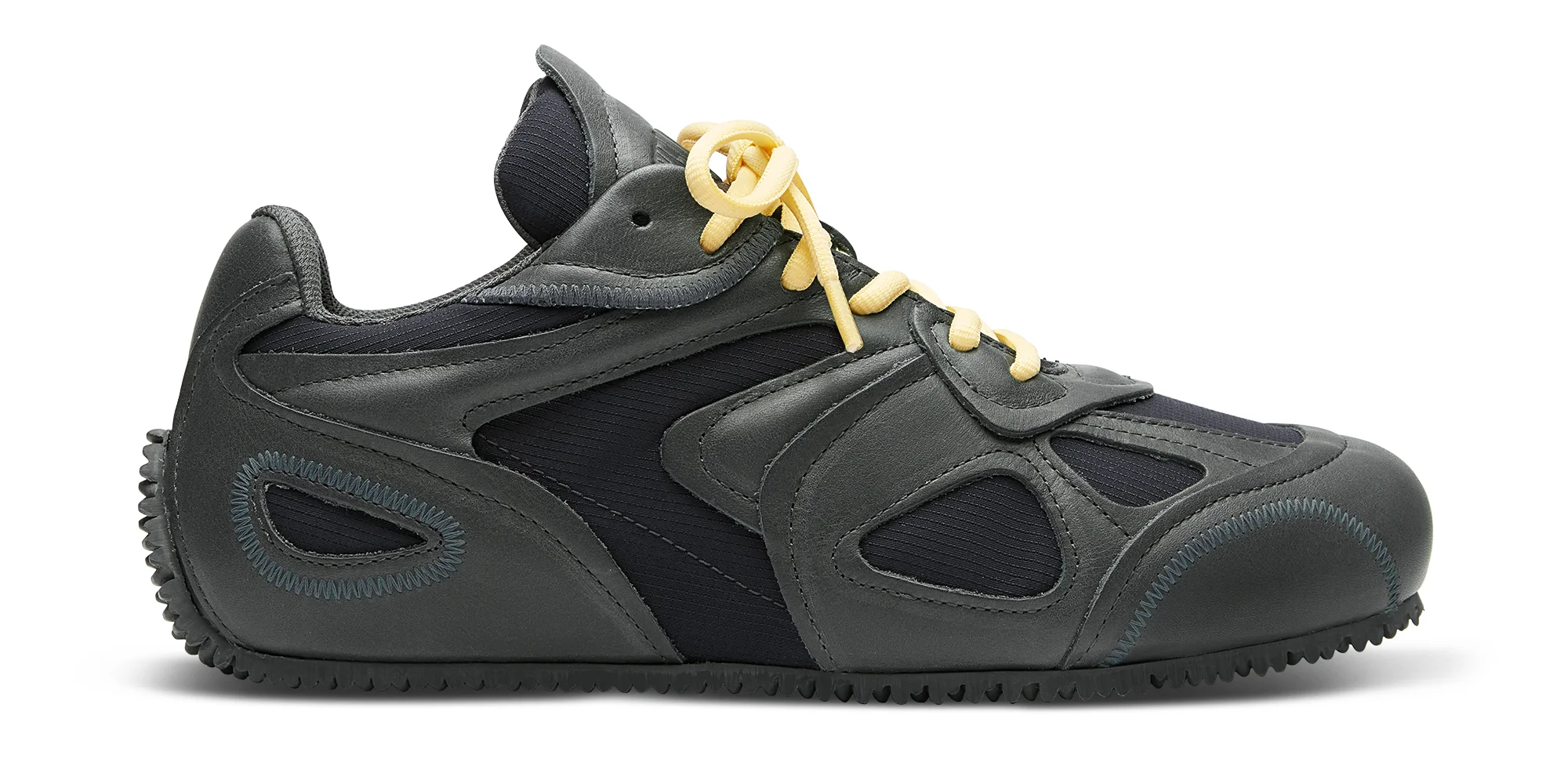 The Slow Runner’s layered, low-profile silhouette embodies the ethos of deconstruction and innovation. A seamless blend of old and new, the upper reimagines the iconic Marathon Runner through familiar intricate smooth leather and recycled textile panels. This model is set on a sleek, flat outsole with a unique knit-inspired finish that echoes design elements from our ready-to-wear collections. Each pair comes with three sets of laces for versatile styling, including one tonal pair, one in soft tofu, and one in a bold pop colour. Style Details - Upper: 60% Leather, 20% Recycled Polyester, 20% Elastane - Lining: 85% Recycled Polyester, 15% Microfibre - Sole: 100% Rubber - Height measures 7mm - European Sizing - Ripstop panels - Round laces - Debossed tongue branding - Handmade in Portugal