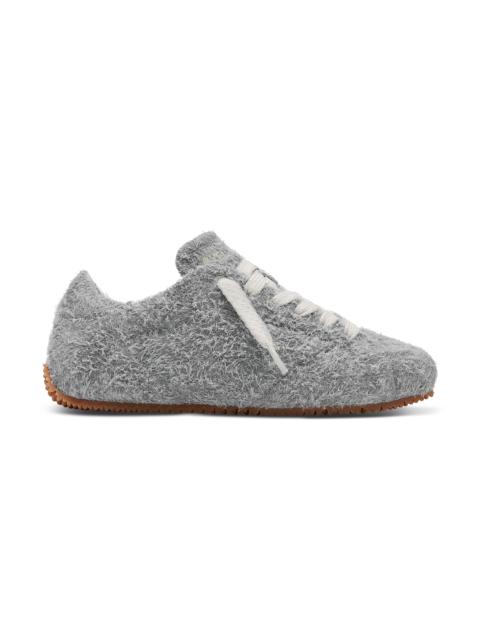 The Tact Runner’s low-profile silhouette is distinctly bold – blending a minimalist design approach with experimental materials. Trimmed with leather, it’s handcrafted in Portugal from Italian suede that’s brushed for a uniquely fluffy texture. Handdrawn chain-stitch embroidery subtly details the tongue, while the rubber sole is uniquely molded to resemble knitwear. This pair comes with a second set of tonal laces. Style Details - Upper: 100% Suede - Lining: 67% Leather, 33% Recycled Polyester - Sole: 100% Rubber - Height Measures 7mm - European Sizing - Flat textured - Hand drawn chain stitch embroidered branding - Handcrafted in Portugal