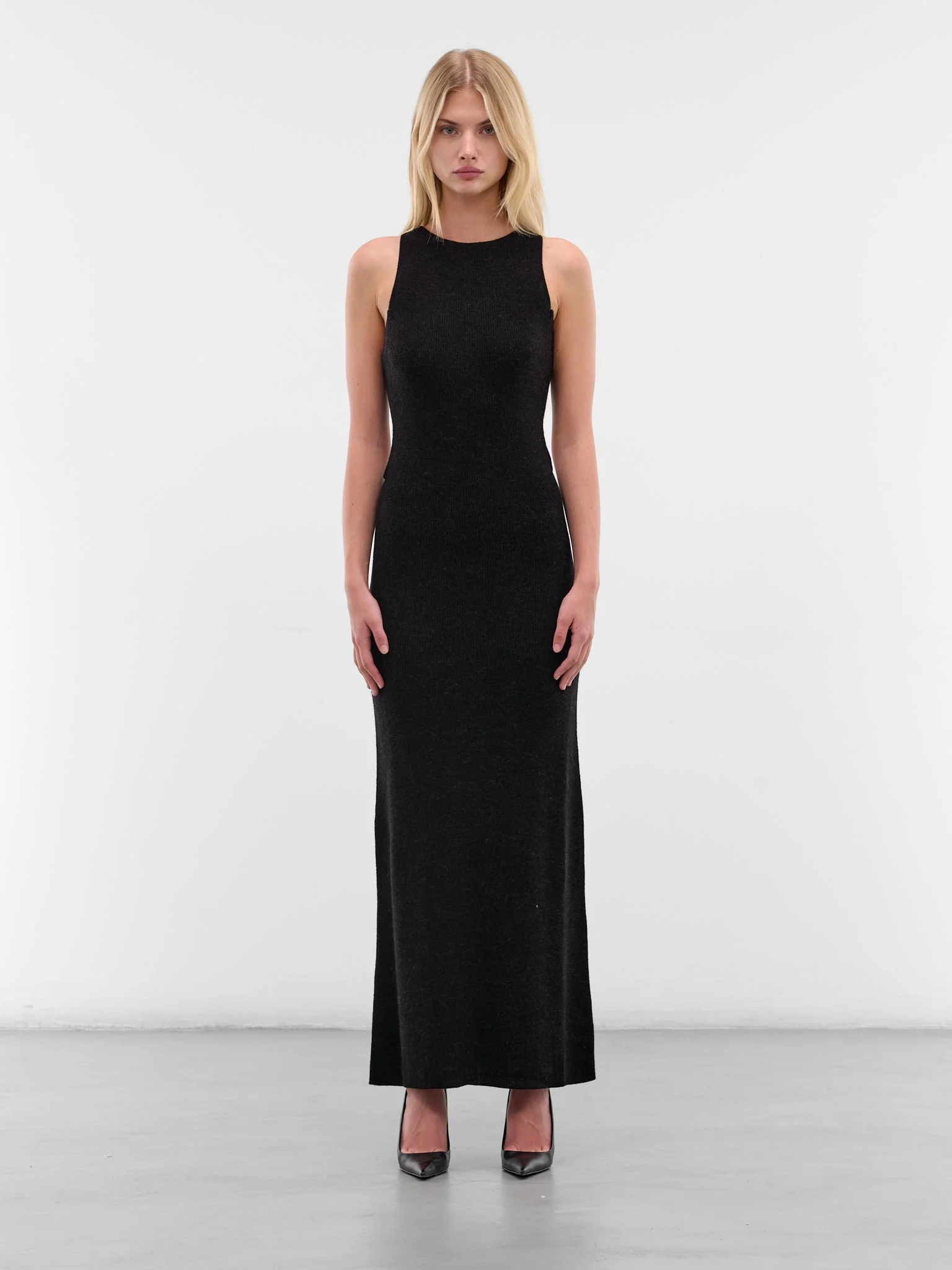 A black wool-alpaca knit dress with a sculptural back design. The cross straps, cut-outs, and tie fastening contrast structure with fluid layering. Featuring: • Slim fit • Wool-alpaca blend knit construction • Round neck • Sleeveless with armholes • Back cross straps and self-tie fastening • Layered back cut-outs • Maxi length • Made in South Korea • 53% Wool 30% Nylon 17% Alpaca • Standard sizing Model is 5'8" wearing size S. Bust: 32" Waist: 23" Hips: 34"