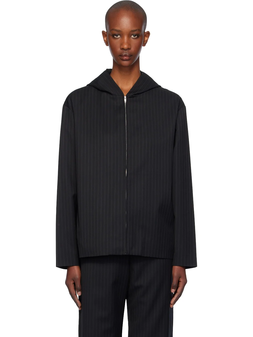 Wool- and polyester-blend twill jacket. Stripe pattern throughout. · Hood at round neck · Zip closure · Dropped shoulders · Fully lined Supplier color: Charcoal
