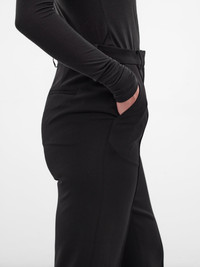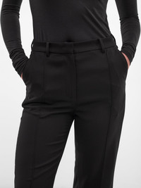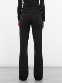 Black acetate-poly trousers with a refined flare. The high waist, traveler’s crease, and panel detailing create an elongated, sculpted line. Featuring: • Slim fit • Acetate-poly paneled construction • High-waisted design • Belt loops • Front concealed zip fly closure • Traveler’s crease • Side and back welt pockets • Flared leg • Made in China • 65% Acetate 35% Polyester • Standard sizing Model is 5'8" wearing size S. Bust: 32" Waist: 23" Hips: 34"