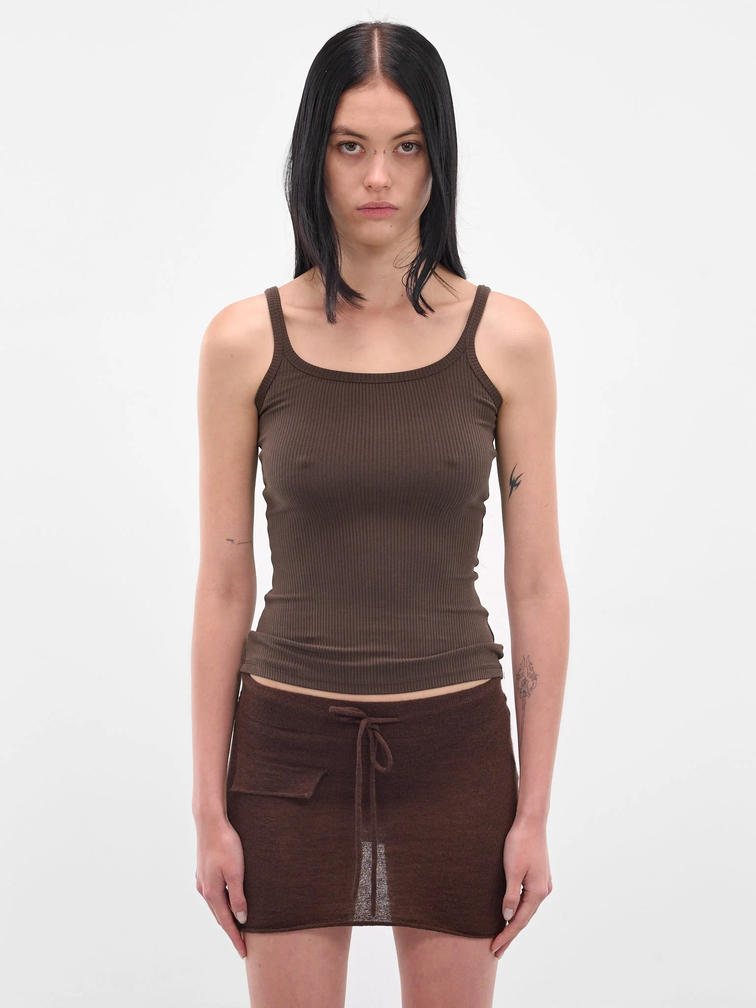 The brown ribbed tank features a slim, streamlined shape with a scoop neck and subtle rib texture for an understated, everyday layer. Featuring: • Slim fit • Scoop neck with shoulder straps • Sleeveless with armholes • Ribbed construction • Made in Portugal • 96% Cupro 4% Elastane • Standard sizing Model is 5'8" wearing size S. Bust: 28.5" Waist: 22.5" Hips: 33.5"