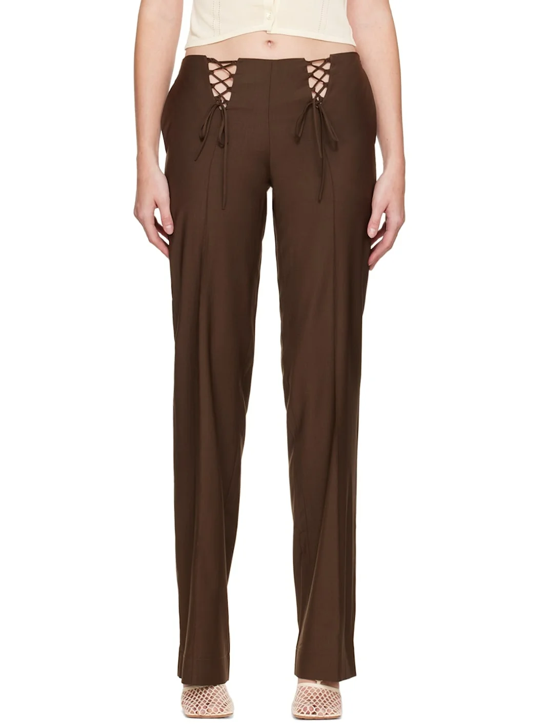 Plain-woven wool-blend trousers. · Lace-up detailing at front waistband · Three-pocket styling · Pinched seams at front legs · Zip closure at outseam Supplier color: Chocolate 86% wool, 10% nylon, 4% lycra. Made in Georgia 222188F087015