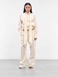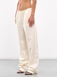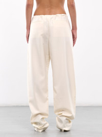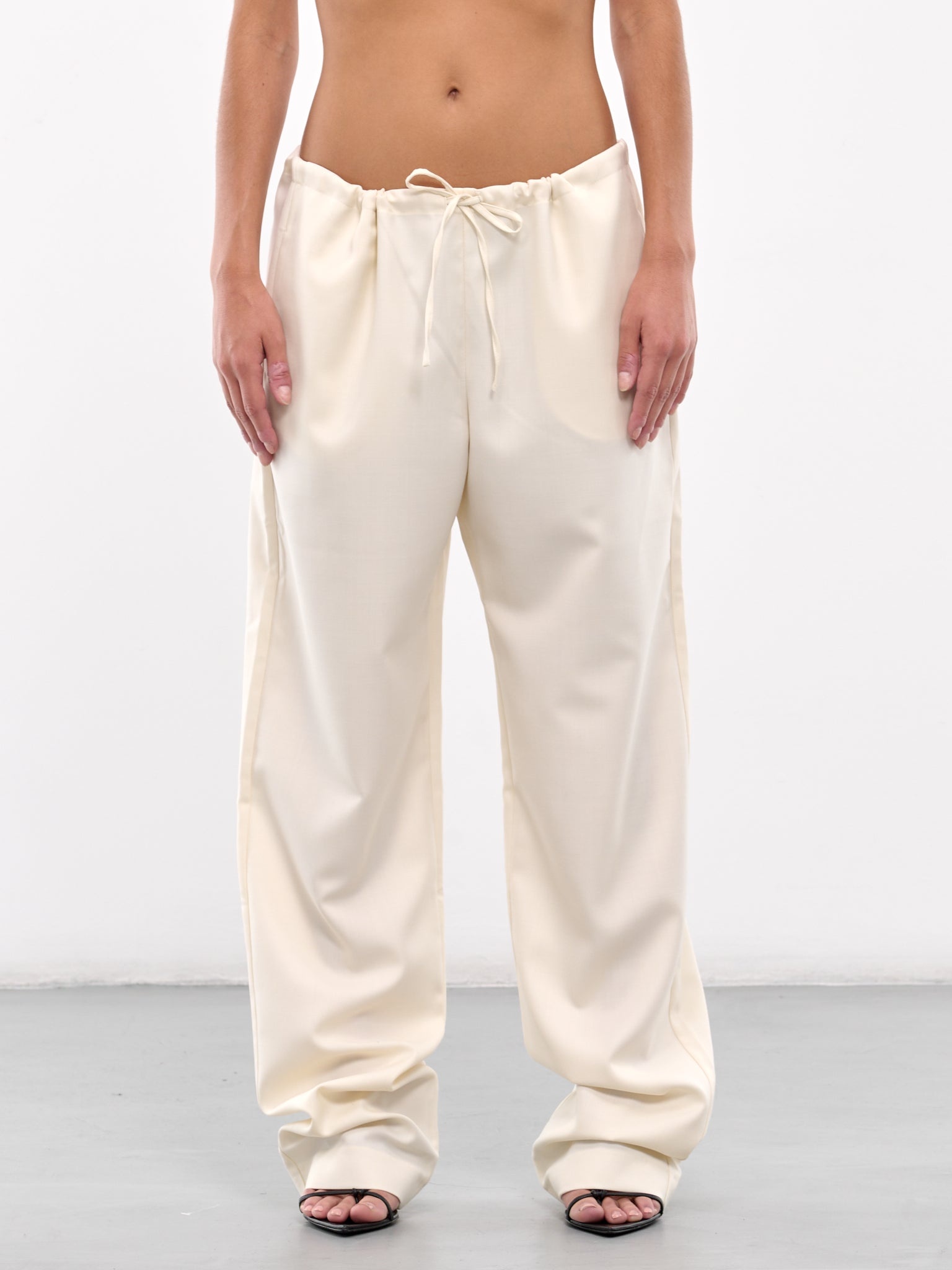 AYA MUSE pants in white, poly-wool blend, paneled construction, adjustable drawstring, side pockets, back welt pockets, straight leg, relaxed fit. Made in Georgia 50% Polyester 50% Wool Standard Sizing Model is 5'8" wearing size S. Bust: 32" Waist: 24" Hips: 33"