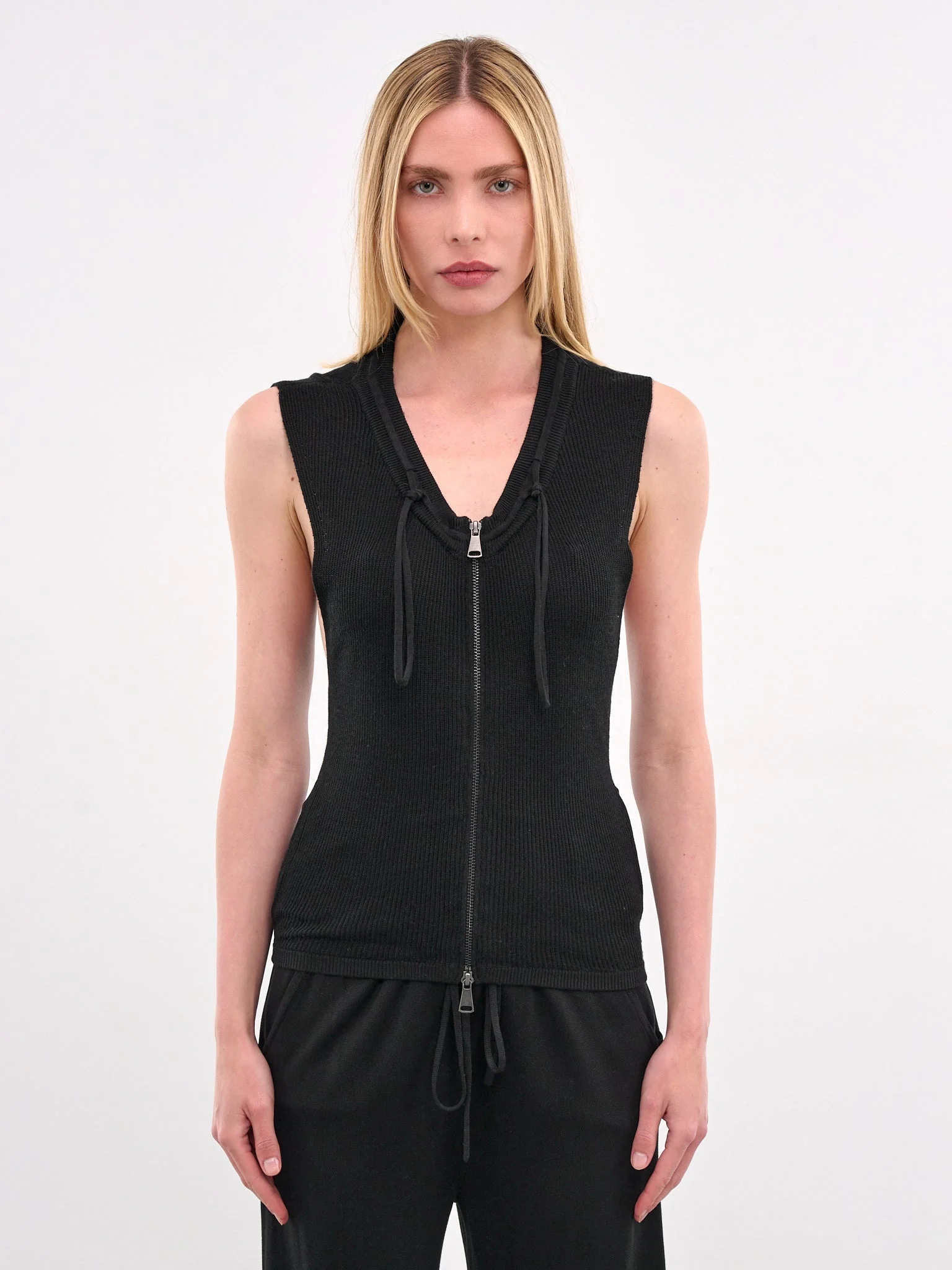 AYA MUSE tank in black, silk-cashmere blend, paneled knit construction, rib-knit, plunged neckline, collar knot drawstring, front exposed two-way zip closure, sleeveless, armscyes, straight hem, slim fit. Made in China 85% Silk 15% Cashmere Standard Sizing Model is 5'8" wearing size S. Bust: 32" Waist: 24" Hips: 35"