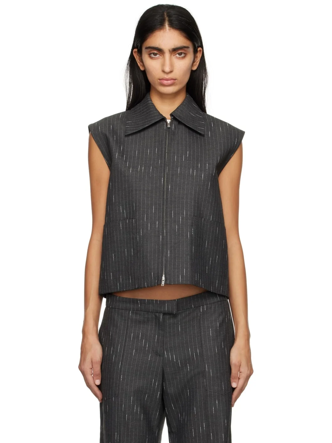 Stretch polyester- and viscose-blend twill vest. Pinstripes throughout. · Pointed collar · Two-way zip closure · Welt pockets · Curved hem · Full satin lining Supplier color: Charcoal Body: 63% polyester, 33% viscose, 4% lycra. Lining: 100% polyester. Made in Georgia 241188F068005