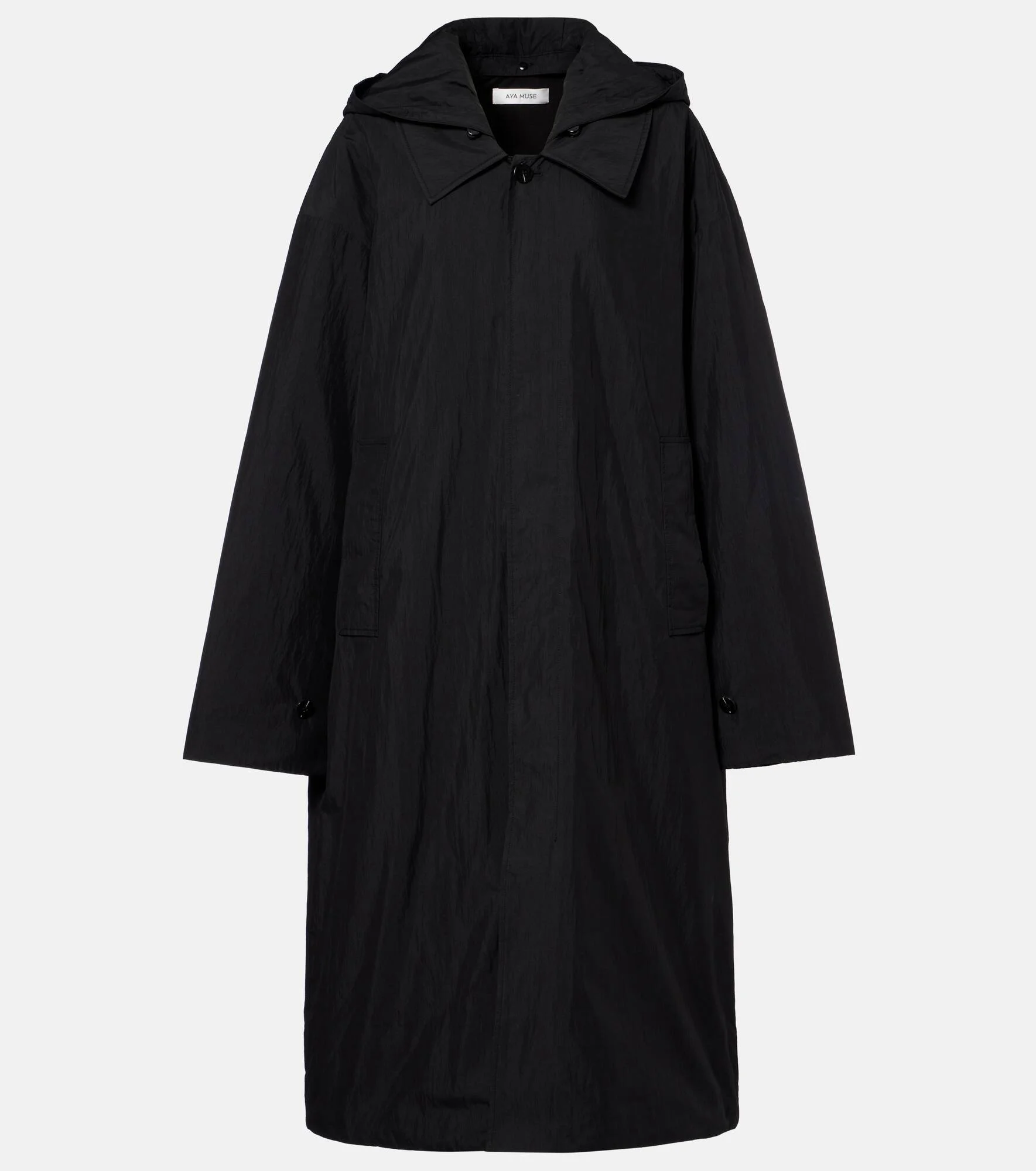 Designed in Los Angeles, Aya Muse has established itself as a go-to destination for standout essentials. Crafted from a soft cotton blend, this padded coat features a removable hood, a point collar, and practical welt pockets. Product Details - Material: 78% cotton, 22% nylon - Care instructions: machine wash at 30 degrees - Made in China - Designer color name: Black - Item color: black - Closure: concealed buttoned front - Collar: classic (Straight point) - Detachable hood - Pockets: welt pockets - Cuff: buttoned - Item number: P01088276 Size & Fit - True to size - For a closer fit, we recommend taking one size down - Dropped shoulders - Oversized - Non-stretchy fabric - The model seen in the picture is 178cm-5'10" and wearing a size XS