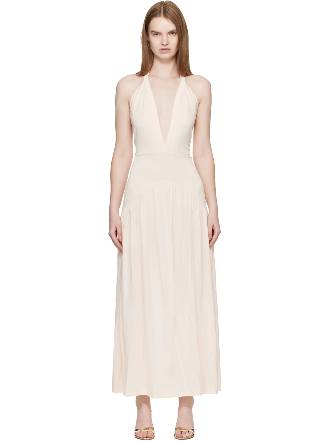 Stretch jersey midi dress. · Plunging neck · Gathering at drop waist · Self-tie halter strap · Low back Supplier color: Pearl 90% viscose, 10% elastane. Made in Portugal 261188F054019
