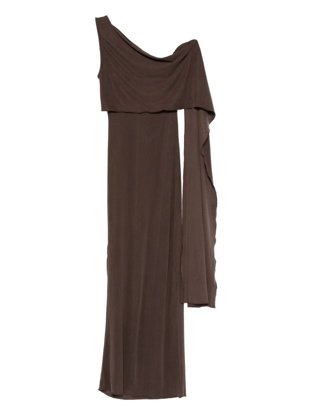 one-shoulder fine-ribbed maxi dress Highlights - Dark brown - Ribbed knit - One-shoulder - Draped sleeve detail - Asymmetric design - Long length Imported Composition Cupro 96%, Elastane 4% SIZE & FIT Model measurements Height 5 ft 11 in(1.8 m) Bust/Chest 31.49 in(80 cm) Hips 36.61 in(93 cm) Waist 24.4 in(62 cm) Washing instructions Machine Wash
