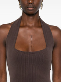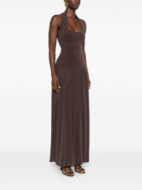 ribbed halterneck dress Highlights - Brown - Ribbed knit - Halterneck - Pleated skirt - Sleeveless Imported Composition Cupro 96%, Elastane 4% SIZE & FIT Model measurements Height 5 ft 10 in(1.77 m) Bust/Chest 32.28 in(82 cm) Hips 35.03 in(89 cm) Waist 25.19 in(64 cm) Washing instructions Read Manufacturer Guidelines