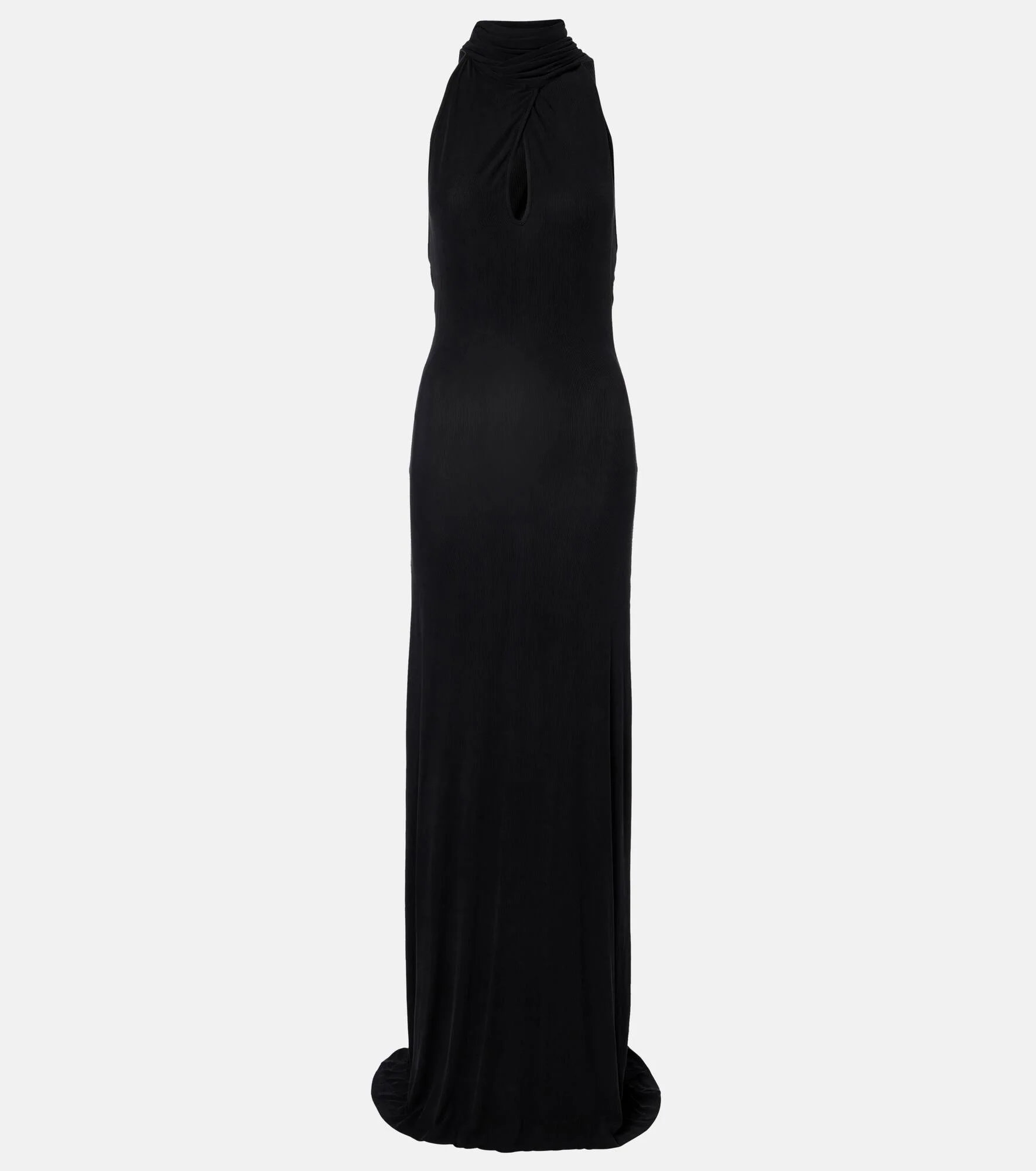Designed in Los Angeles, Aya Muse has established itself as a go-to destination for standout essentials and empowering eveningwear. The Sele gown is tailored to a floor-length silhouette with a halterneck and a front keyhole cutout. Product Details - Material: 96% cupro, 4% elastane - Care instructions: machine wash at 30 degrees - Made in Portugal - Designer color name: Midnight - Item color: black - Item number: P01100615 Size & Fit - True to size - Low back - Fitted - Stretchy fabric - The model seen in the picture is 178cm-5'10" and wearing a size XS