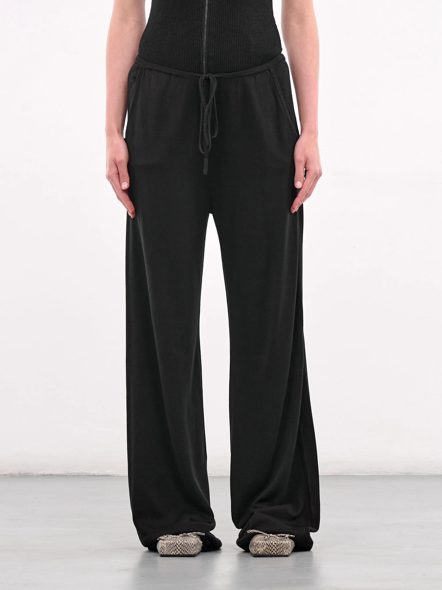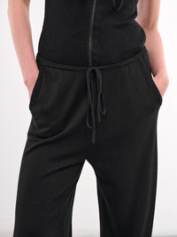 AYA MUSE trousers in black, silk-viscose blend, paneled construction, adjustable drawstring waist, inset pockets, back welt pockets, wide leg, relaxed fit. Made in China 55% Silk 45% Viscose Standard Sizing Model is 5'8" wearing size S. Bust: 32" Waist: 24" Hips: 35"