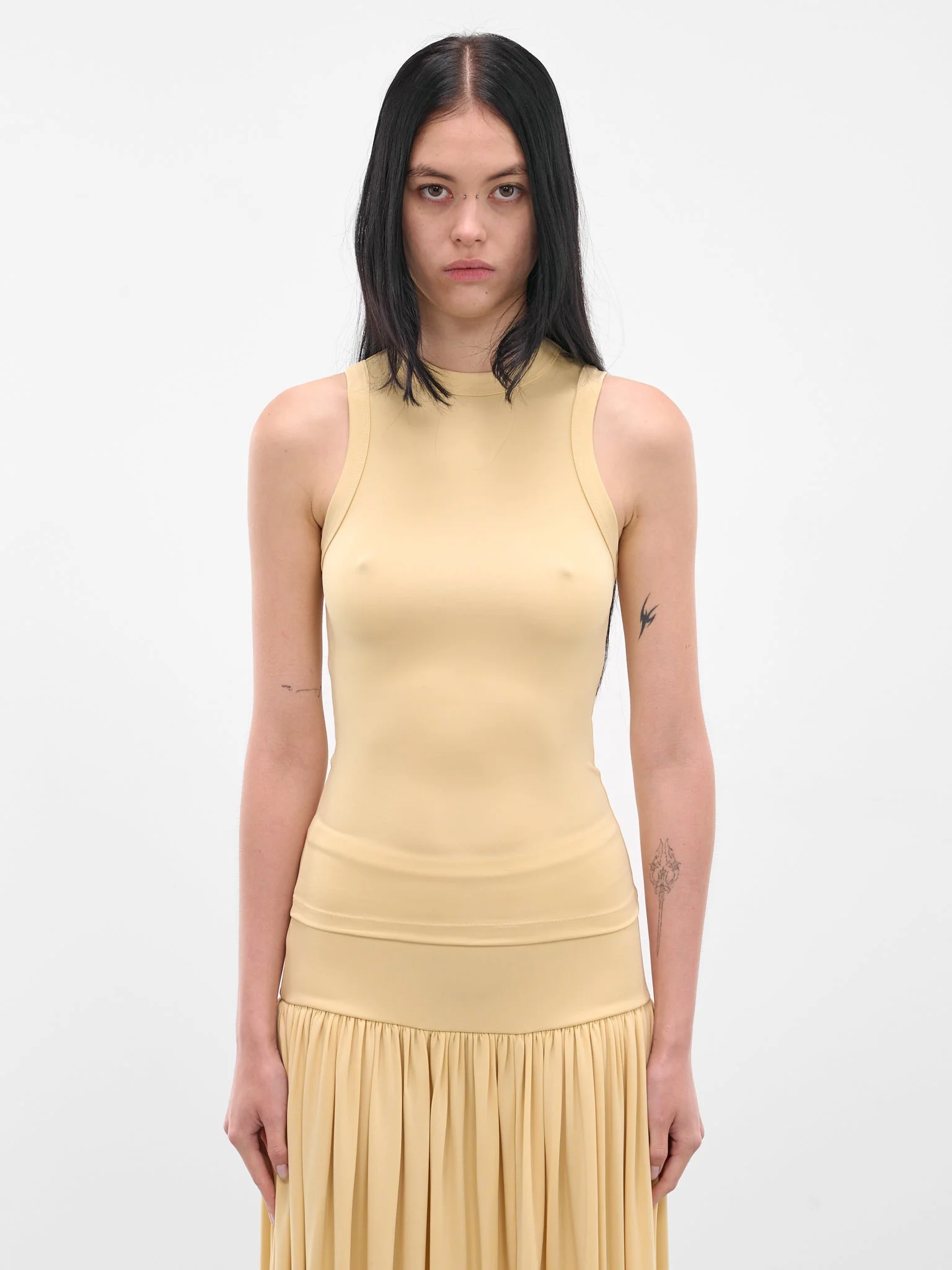 The 'buttercream' yellow Jersey High Neck Tank delivers a sculpted slim fit with a crewneck and shoulder straps, offering a minimal sleeveless silhouette. Featuring: • Slim fit • Crewneck • Shoulder straps • Sleeveless with armholes • Made in Portugal • 97% Viscose 3% Elastane • Standard sizing Model is 5'8" wearing size S. Bust: 28.5" Waist: 22.5" Hips: 33.5"