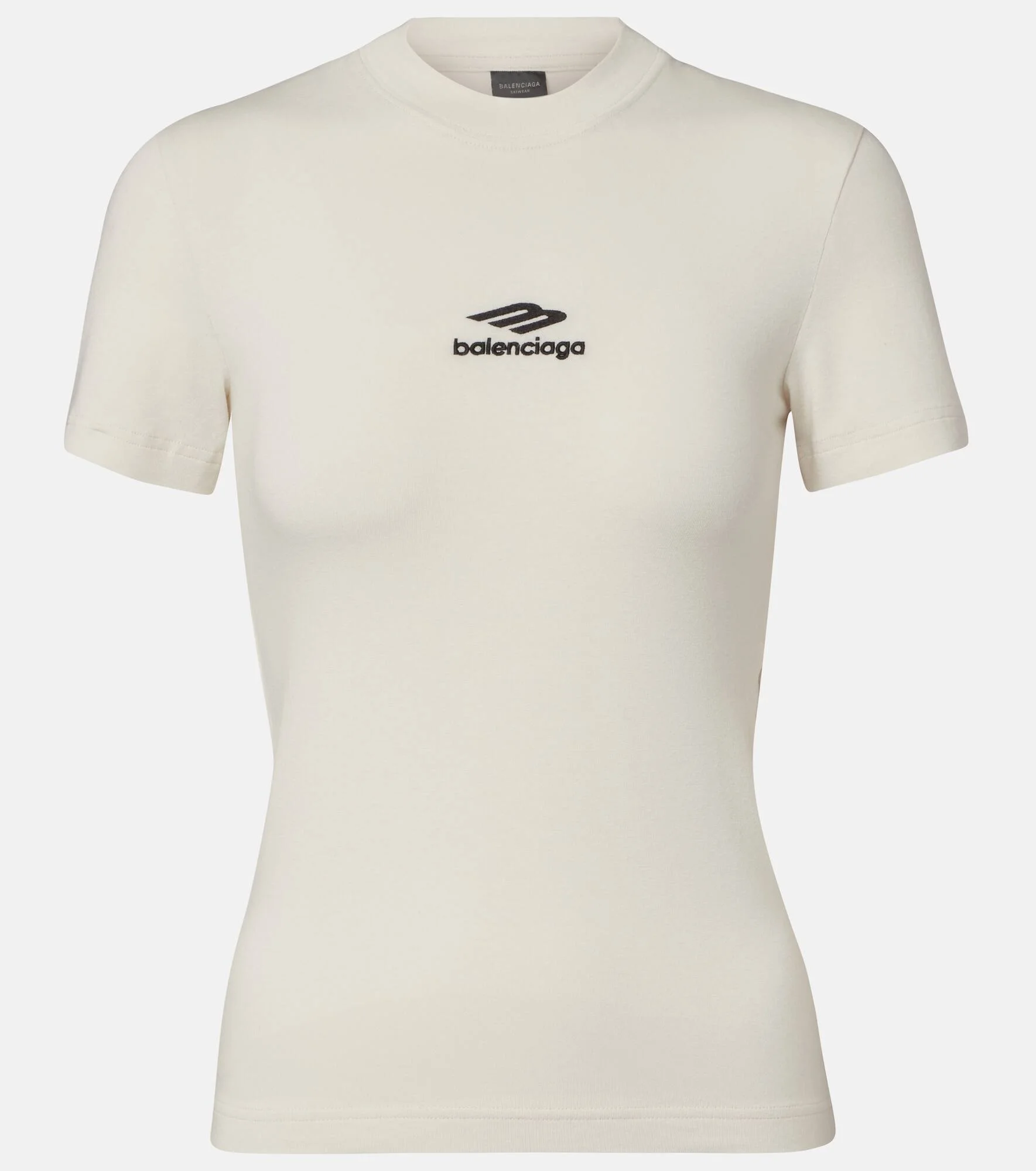 This short-sleeved top from Balenciaga is crafted in a cotton blend thermal stretch jersey and features a rounded neckline. The piece is complete with an embroidered 3B Sports Icon logo on the front. Product Details - Material: 67% cotton, 28% acrylic, 5% elastane - Care instructions: machine wash at 30 degrees - Made in Portugal - Designer color name: Chalky White/Black - Item color: white - Embroidery: 100% polyester - Collar: crewneck - Item number: P01118890 Size & Fit - True to size - Semi-sheer - Fitted - Stretchy fabric - Falls to the hip - The model seen in the picture is 178cm-5'10" and wearing a size XS