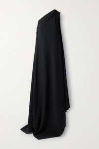 Asymmetric one-shoulder frayed draped crepe gown Black
