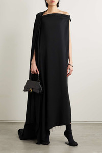 Balenciaga's gown features a dramatic cape-effect back that drapes down to the floor and leaves a short train. Made from crepe, it has an asymmetric neckline and frayed edges for a purposely undone feel. Wear yours with sock boots and one of the label's totes. Details & Care - Black crepe - Slips on - 66% viscose, 31% acetate, 3% elastane - Dry clean