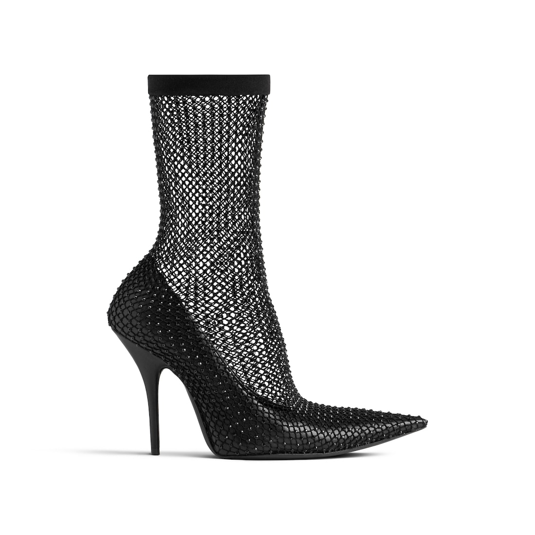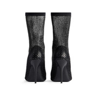 Avenue 110mm Bootie in black shiny Nappa lambskin and fishnet with rhinestones PRODUCT DETAILS • Shiny Nappa lambskin, polyamide and elastane • Fishnet with rhinestones on the upper • Bootie • Elongated pointed toe • 110mm arch • Knife heel • Tone-on-tone covered heel • Black sole • Made in Italy Upper: polyamide, elastane, lambskin - Sole: calfskin, TPU - Insole: goatskin