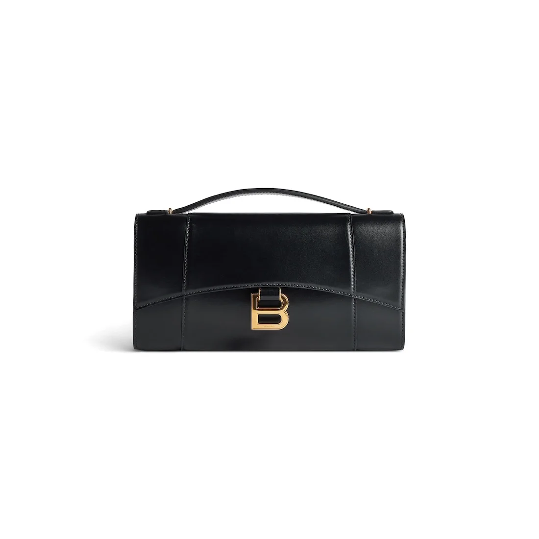 Hourglass Pochette With Chain in black shiny box calfskin, shiny gold hardware PRODUCT DETAILS • Dimensions: L10,2 x H6,7 x W1,7 inch • Shiny box calfskin • Pochette • One handle • Removable chain strap (drop: 21,6 inch) • Crossbody and hand carry • Shiny gold B logo hardware • Studded magnet closure • 1 main compartment • 6 inner card slots • Nappa lambskin lining • Made in Italy Material: calfskin