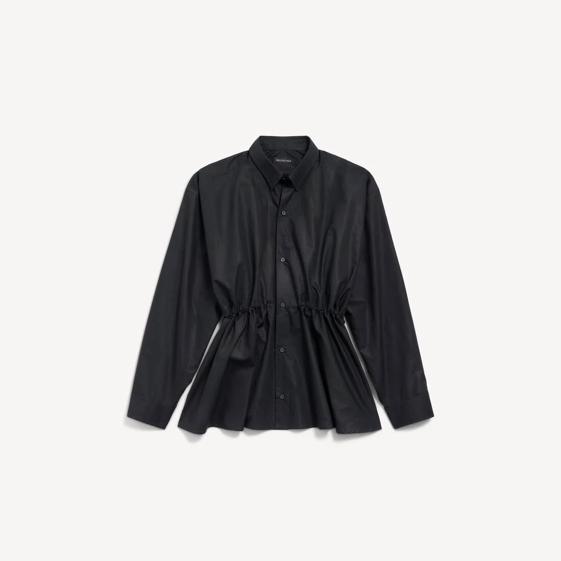 Hourglass Shirt Dress in black regenerative cotton poplin for Women PRODUCT DETAILS • Regenerative cotton poplin • Hourglass fit: elasticated, cinched at the waist • Button-down collar • 6 button front • Long sleeves • Buttoned cuffs • Balenciaga engraved buttons • Made in Italy Main material: 100% cotton