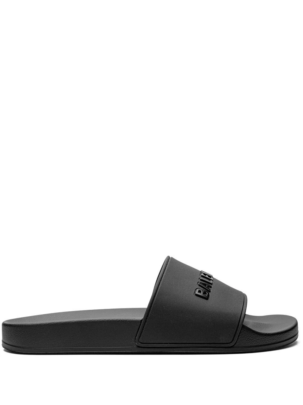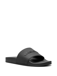 logo-embossed pool slides Balancing clean lines with contemporary elements, these Balenciaga pool slides are produced in a sleek black hue and enhanced with a contrasting logo lettering at the upper. Highlights - Black - Embossed logo to the front - Open toe - Moulded footbed - Flat rubber sole Imported Composition Sole: Rubber 100% Lining: Rubber 100% Outer: Rubber 100% SIZE & FIT Measurement HEEL 1.18 in(3 cm) Sole height 0.98 in(2.5 cm)