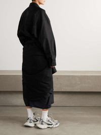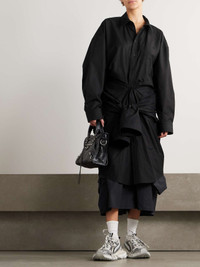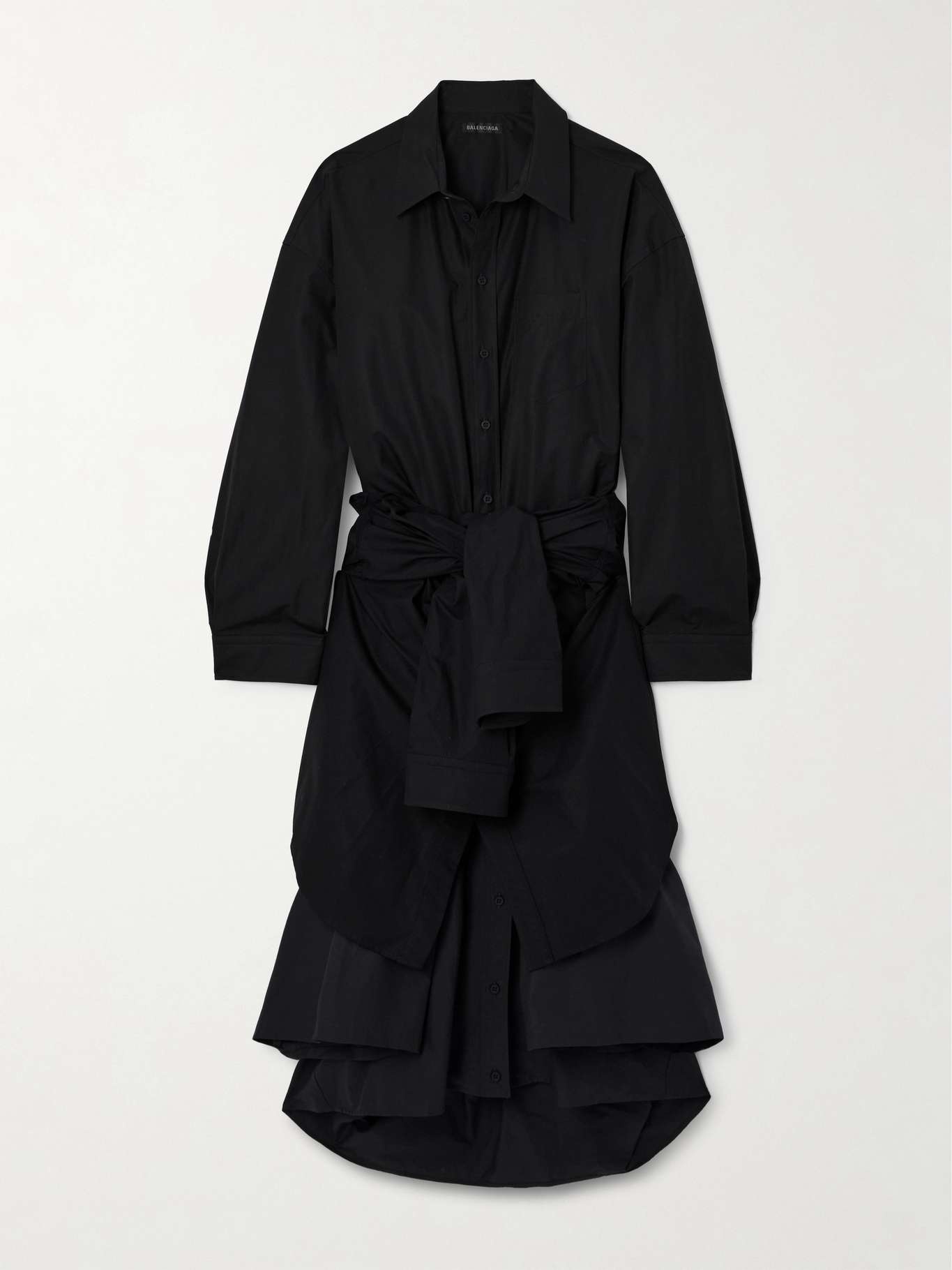Balenciaga's shirt dress is made from layers of crisp cotton-poplin that create a layered hem. It cinches at the waist with ties that look like an extra pair of sleeves and has a neat collar. Details & Care - Black and navy cotton-poplin - Button fastenings through front - 100% cotton - Dry clean
