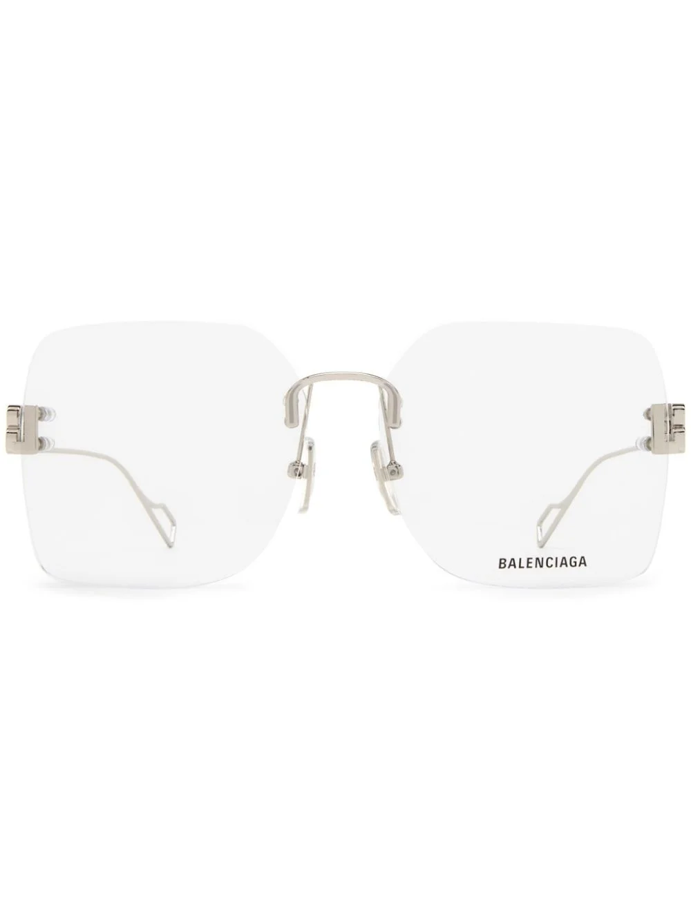 BB rimless glasses A rimless design for a lighter frame, but never forgetting about the style added by silver-tone titanium details of BB logo plaques on the side of these Balenciaga Sunglasses. These are titanium, but please, don't try to shoot them down because they aren't SIA - they will fall. Made in Italy Composition Metal 100% SIZE & FIT Measurement Arm Length 5.51 in(14 cm) Bridge Width 0.59 in(1.5 cm) Lens Diameter 2.36 in(6 cm) Total Width 5.55 in(14.1 cm)