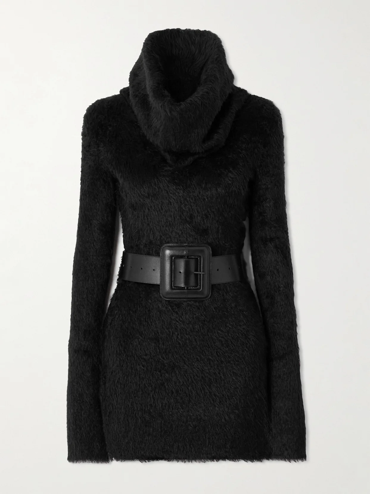 Belted Brushed-knit Turtleneck Mini Dress
